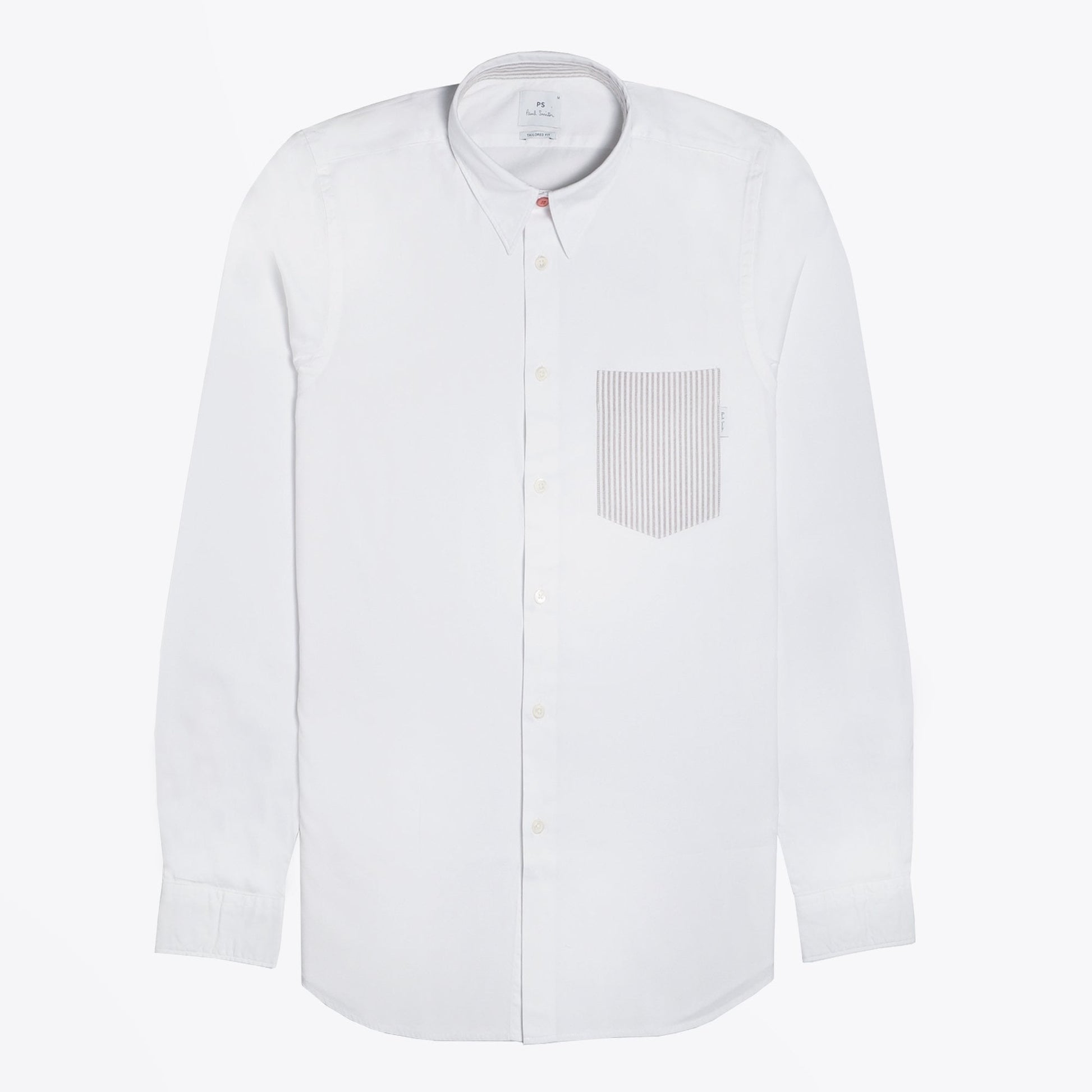 Paul Smith is a distinguished British designer who is renowned for his creative aesthetic, which combines tradition and modernity. This long-sleeve contemporary tailored-fit shirt is crafted in a lightweight cotton and comes complete with an eclectic touch of a contrast stripe pocket on the chest and a stripe print on the inside of the cuff and collar. Other features include natural shell buttons with contrasting pink top button, curved hemline and soft point collar.  Finishing touches to this smart shirt include a two-button cuff, Paul Smith tab on the pocket and topstitching detailing. Men’s classic shirts with a hint of quirk are a Paul Smith staple.