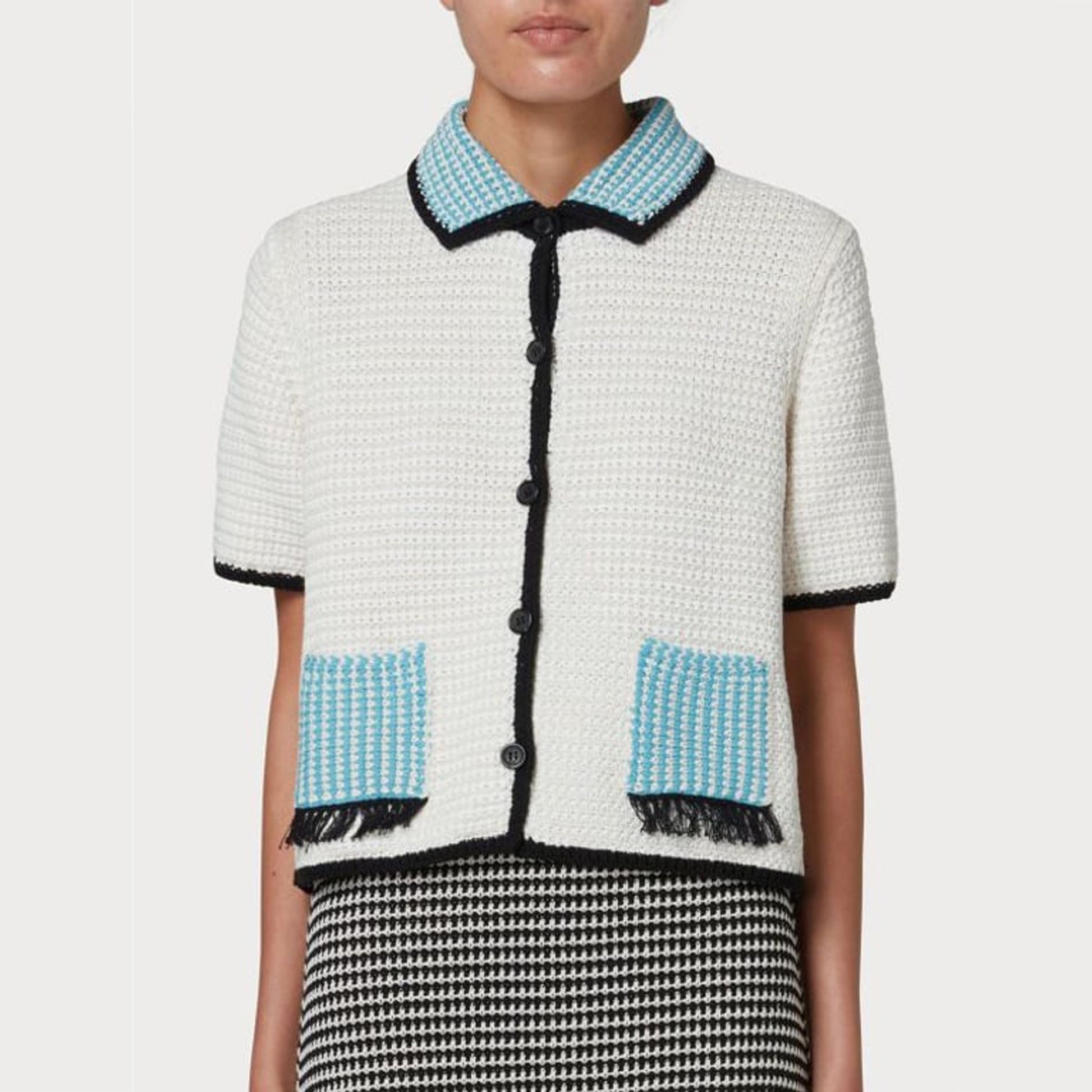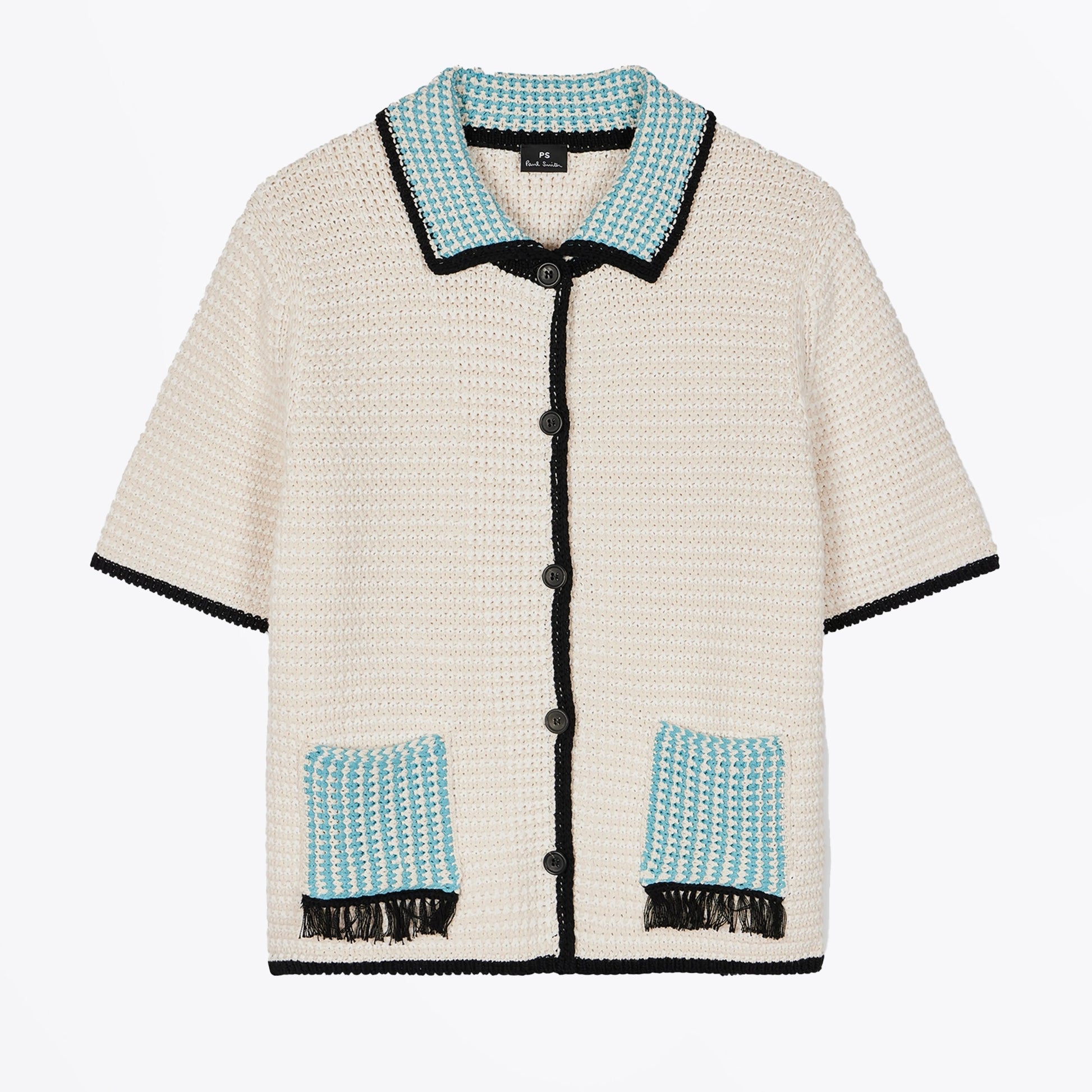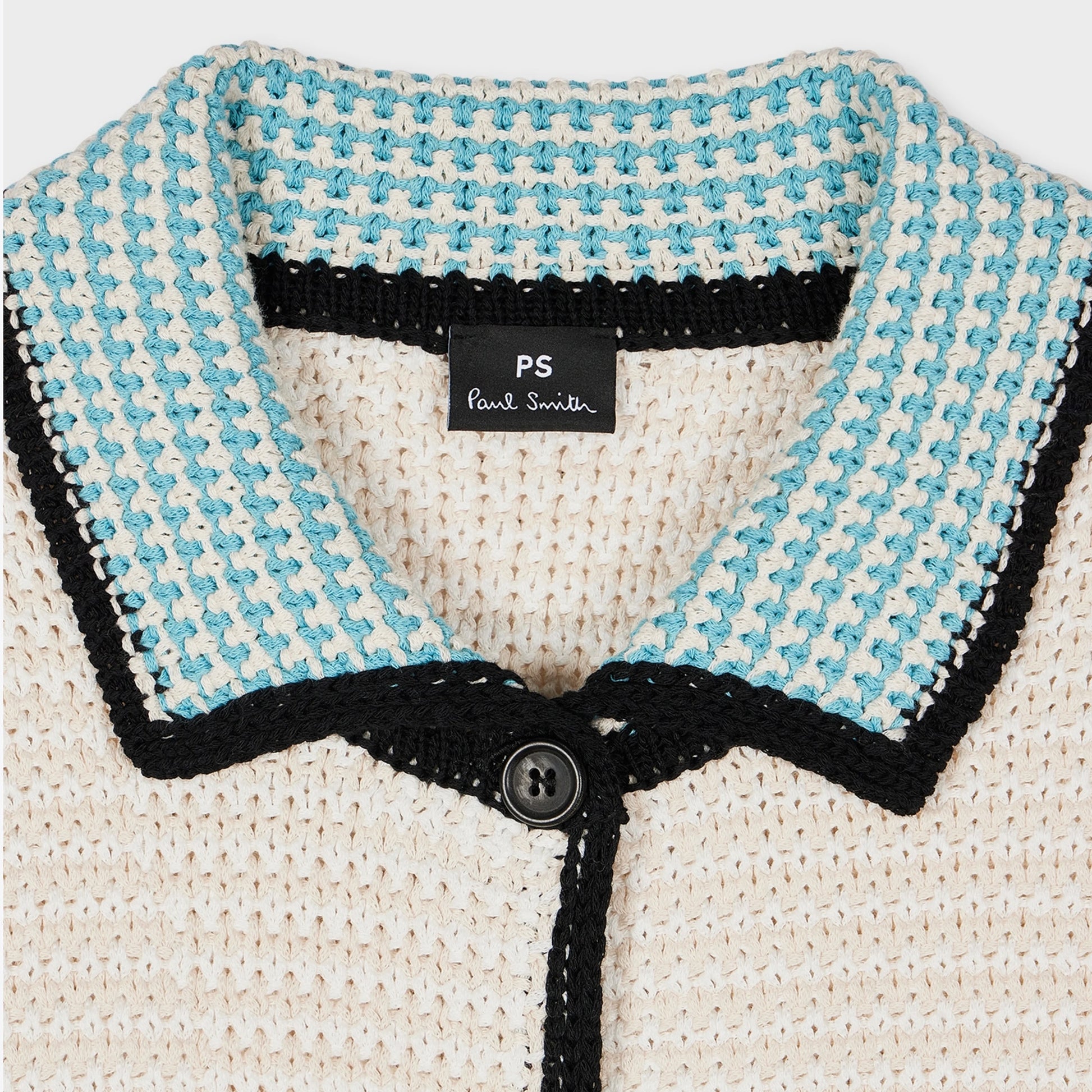 Paul Smith is a distinguished British designer who is renowned for his creative aesthetic, which combines tradition and modernity. Add a touch of fun to your knitwear collection with this Paul Smith cardigan. Featuring a quirky crochet pattern, this cardigan has tasselled details on the pockets with blue accents, with a button front design and monochrome trim. Style this cardigan over a plain t-shirt, with your favourite designer jeans and some Veja trainers for a great casual look.