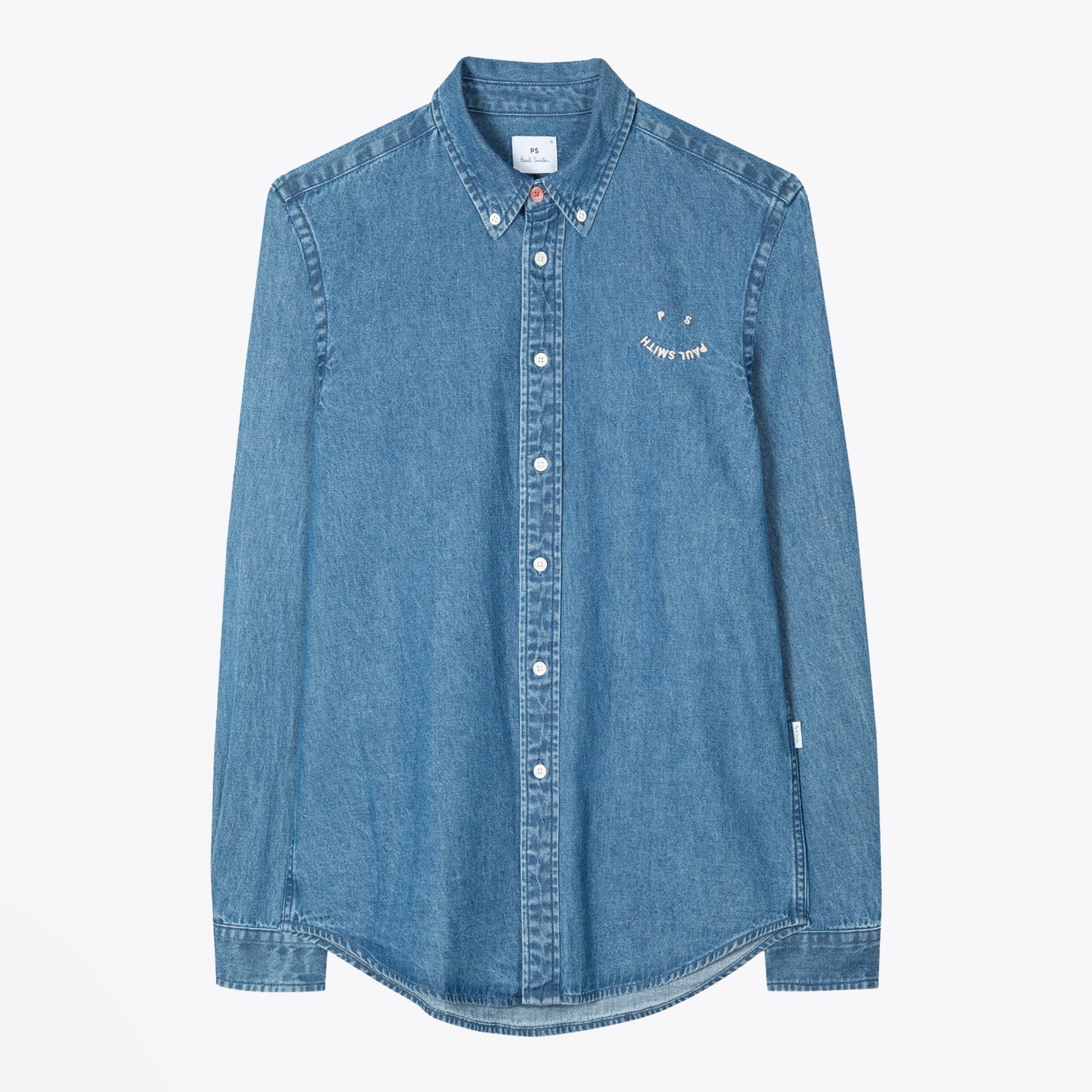 Paul Smith is a distinguished British designer who is renowned for his creative aesthetic, which combines tradition and modernity. This long-sleeve tailored-fit denim shirt is crafted in a soft cotton and offers a mid-wash finish. Featuring a button-down collar and button-down front, this shirt also features shell buttons with contrasting pink top button, curved hemline, printed cuff lining and an embroidered 'Happy' detail on the chest. Men’s classic shirts with a hint of quirk are a Paul Smith staple.