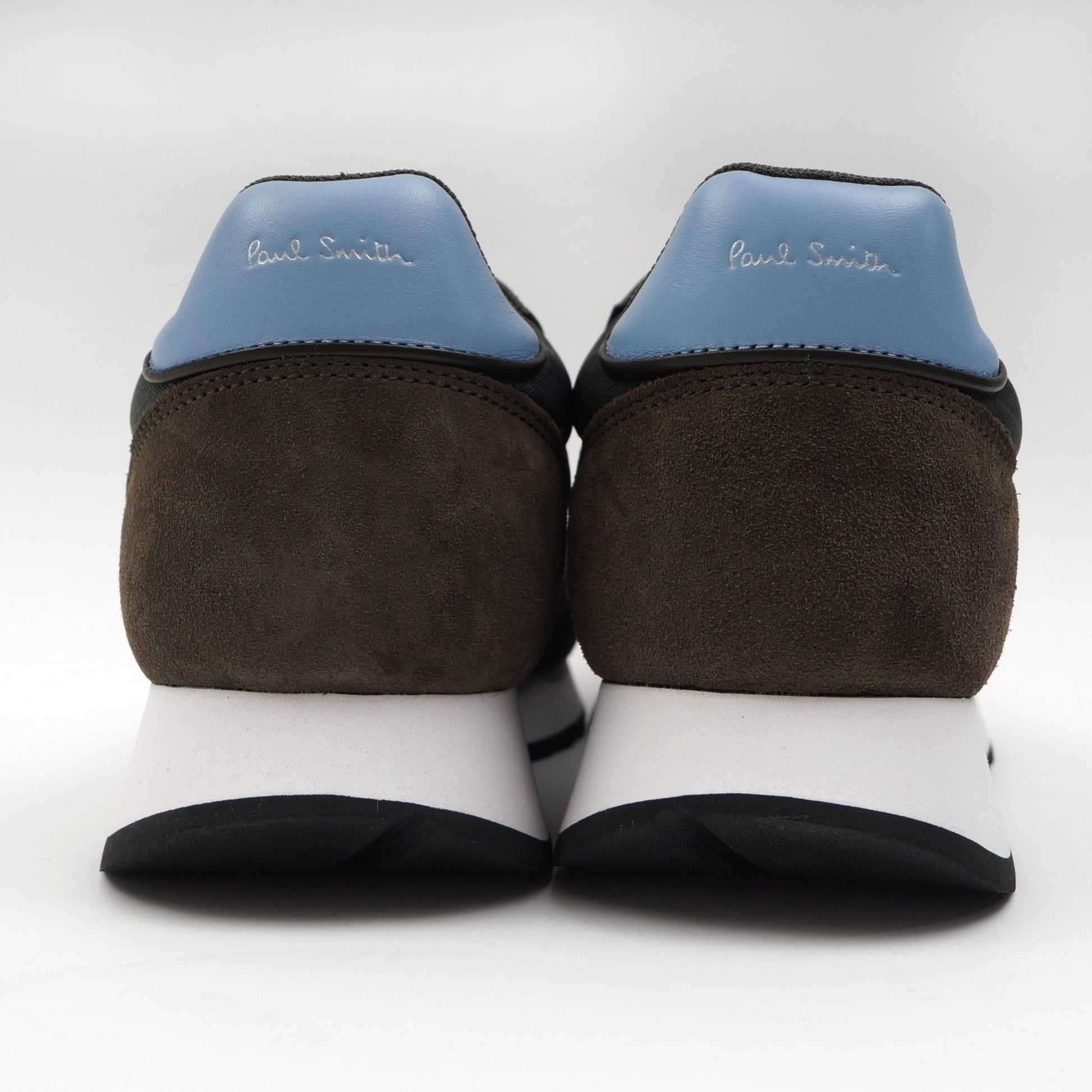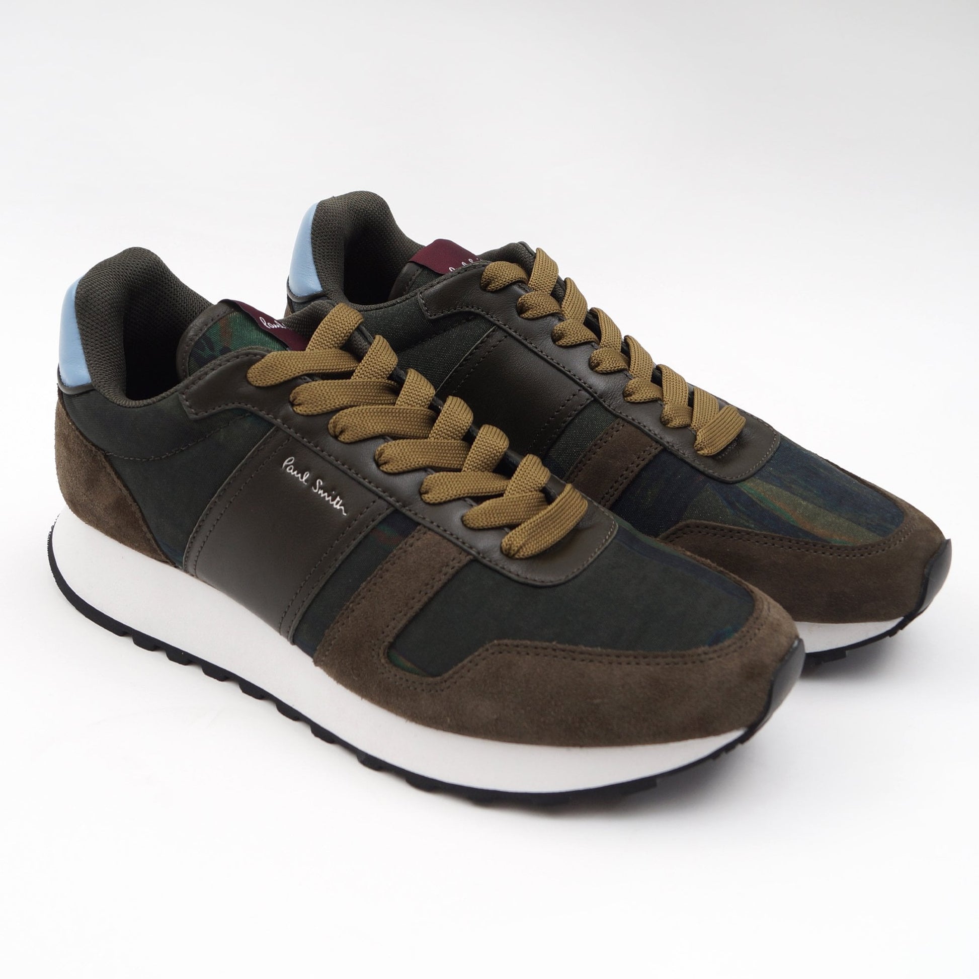 Paul Smith is a distinguished British designer who is renowned for his creative aesthetic, which combines tradition and modernity. Add some designer luxury to your shoe collection with this season with these Paul Smith trainers. Featuring a mix of materials in brown and khaki green shades, these shoes have a contrasting patch of light blue leather at the heel, lace up fastening and the Paul Smith logo embossed on the side in silver text. Wear these shoes with a pair of shorts and a wax London button-down shirt this season.
