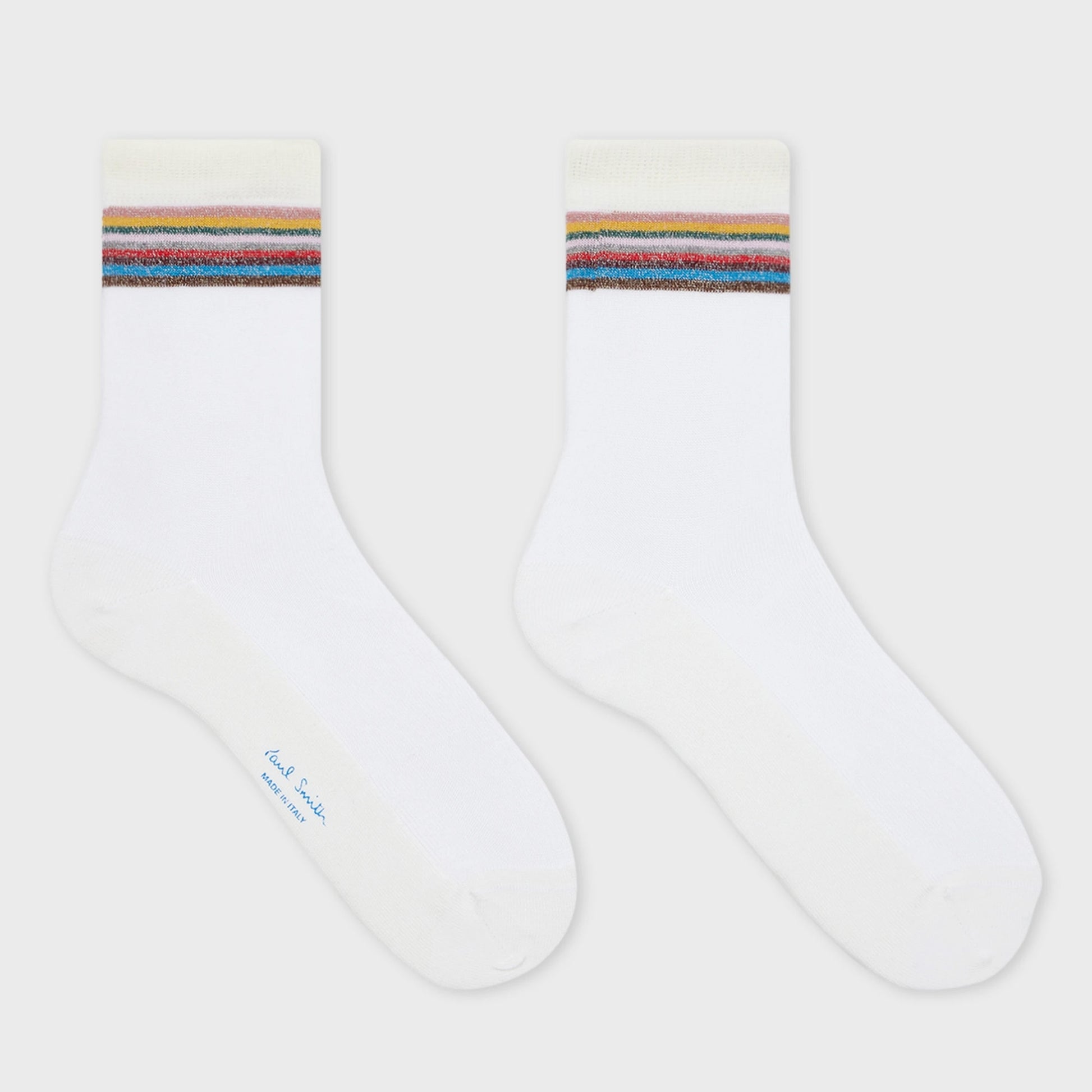 Paul Smith is a distinguished British designer who is renowned for his creative aesthetic, which combines tradition and modernity. Update your wardrobe staples with this option from Paul Smith. These white socks features the signature Paul smith stripe, ribbed hem, and the Paul Smith logo on the sole of the sock.