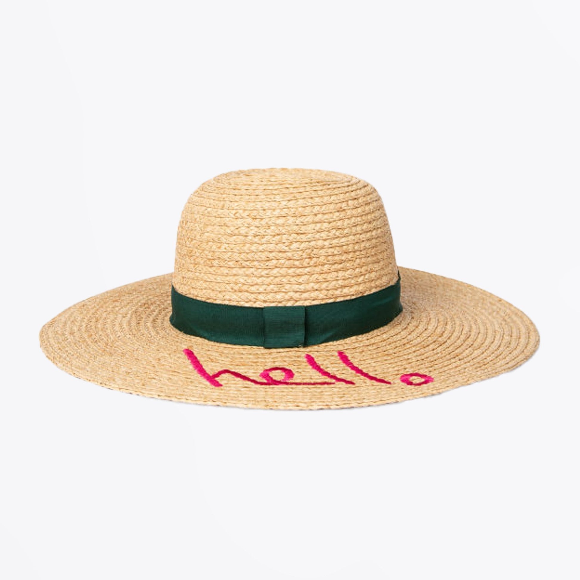 Paul Smith is a distinguished British designer who is renowned for his creative aesthetic, which combines tradition and modernity. Add some fun to your summer accessories this season with this straw wide brim hat, featuring a ‘Hello’ message on the rim, in a pink shade. This hat is finished off with a green ribbon at the rib, for an extra pop pf colour. Wear this hat on your next destination holiday, with a Greek Archaic Kori dress with some heeled espadrilles.
