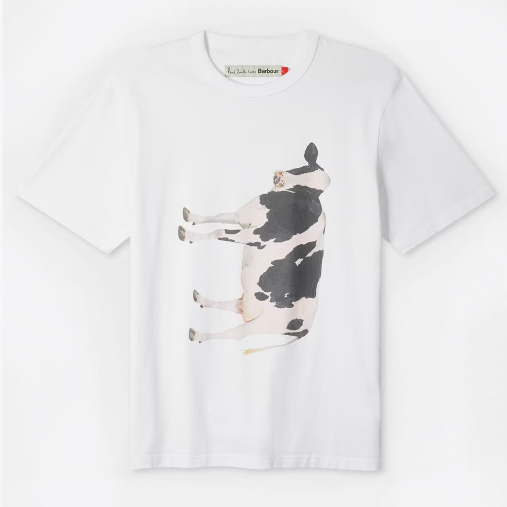 The Paul Smith Loves Barbour Cow Print T-Shirt fuses British countryside charm with modern graphic design. Made from premium cotton, this short-sleeve tee showcases a full-colour Friesian cow motif, drawn from a vintage Paul Smith 1980s sketch and reinterpreted through the “Loves Barbour” collaboration lens. It offers a clean crew neckline and a regular fit, making it a standout casual piece that balances playful identity with quality basics.