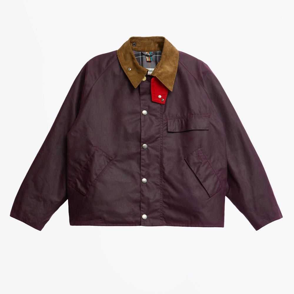 The Paul Smith Loves Barbour Grape Transport Wax Jacket marries Barbour’s time-tested waxed cotton technique with Paul Smith’s inventive detailing. Constructed from 6 oz waxed cotton, it features three external pockets for utilitarian ease, contrast wax details for design flair, and a cozy moleskin throat tab for added comfort on chillier days. With its rich “grape” hue and heritage structure, this jacket seamlessly fuses countryside craftsmanship with contemporary personality.