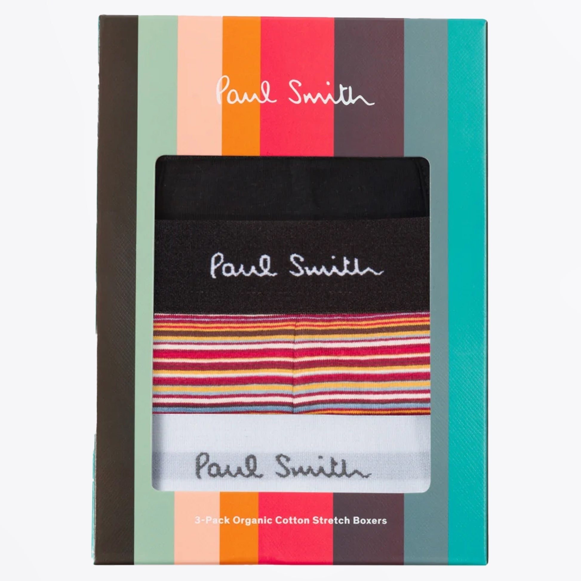 Paul Smith is a distinguished British designer who is renowned for his creative aesthetic, which combines tradition and modernity. Update your wardrobe staples with this option from Paul Smith. This 3 pack trunks features white boxers, striped boxers and black boxers, all three include the Paul Smith logo on the wasteband, all made in a cotton and elastane blend.