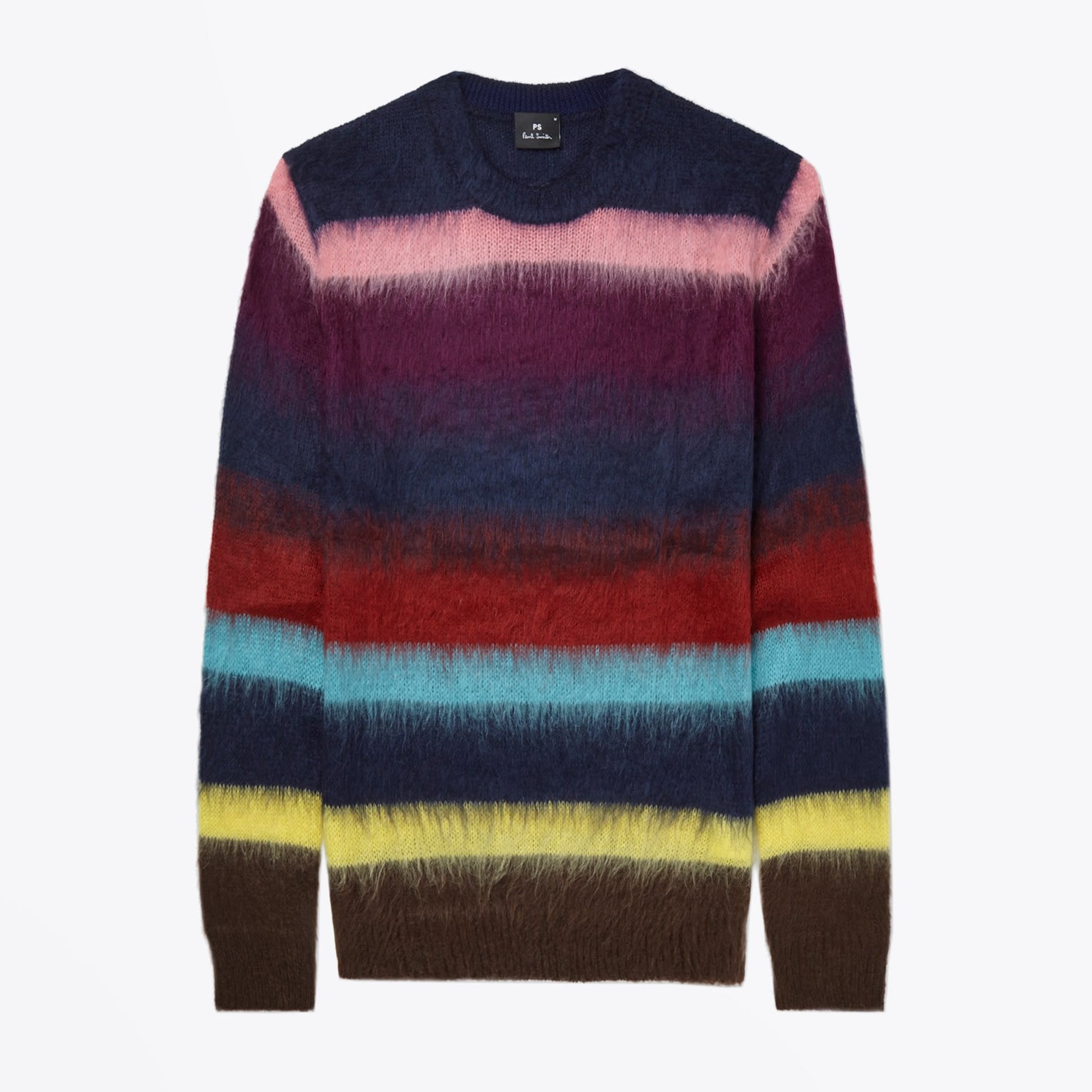 Paul Smith is a distinguished British designer who is renowned for his creative aesthetic, which combines tradition and modernity. Constructed from a wool and mohair-blend yarn this long-sleeve sweater features a crew neckline. Cut for a comfortable fit, this knitted sweater with super soft handle features a multi-colour ombre stripe throughout which has been brushed to give a fuzzy feel and the sleeve stripes line up with body. Team this stylish sweatshirt with Paul Smith jeans to complete your look. It's time to brighten up your wardrobe for the new season with PS Paul Smith!