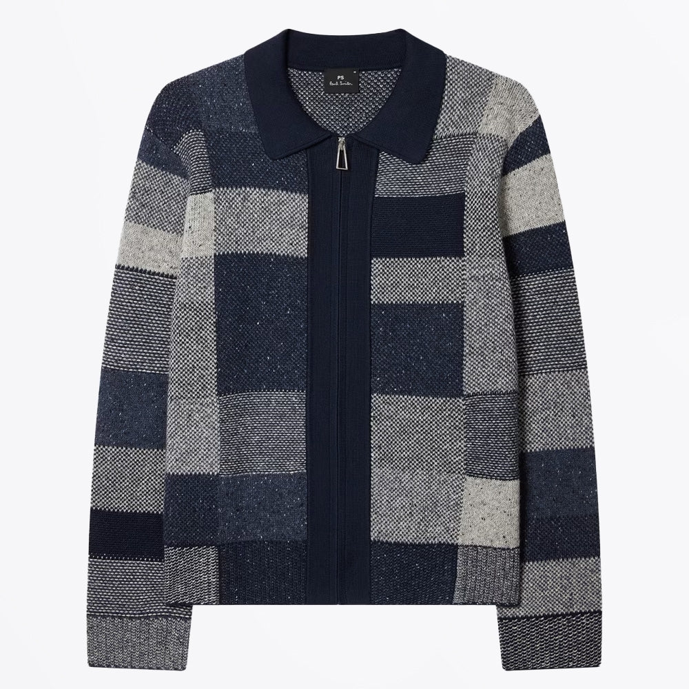Paul Smith is a distinguished British designer who is renowned for his creative aesthetic, which combines tradition and modernity. Update your wardrobe staples with this option from Paul Smith. This navy tonal patchwork zip though cardigan features a collared neckline with a checkered patchwork through it, zip up fastening, long sleeves, ribbed hem and cuffs. Wear this cardigan with some Universal Works trousers and Veja sneakers.