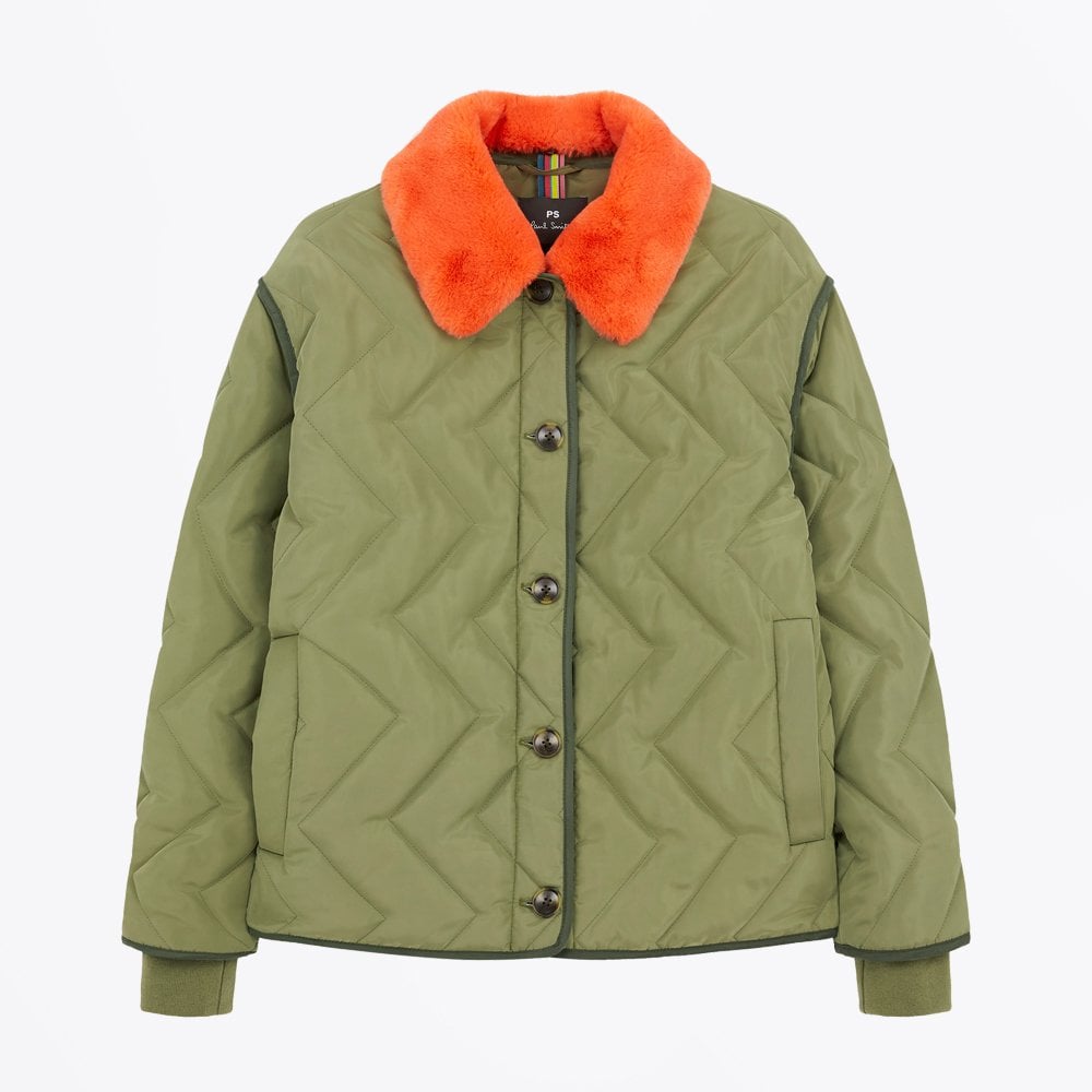 Paul Smith is a distinguished British designer who is renowned for his creative aesthetic, which combines tradition and modernity. Classic with a hint of eclectic is the key element of the brand. This quilted green coat features a vibrant orange detachable fur collar. This coat is finished with button fastening, angled pockets and elastic cuffs. This coat is fully lined.