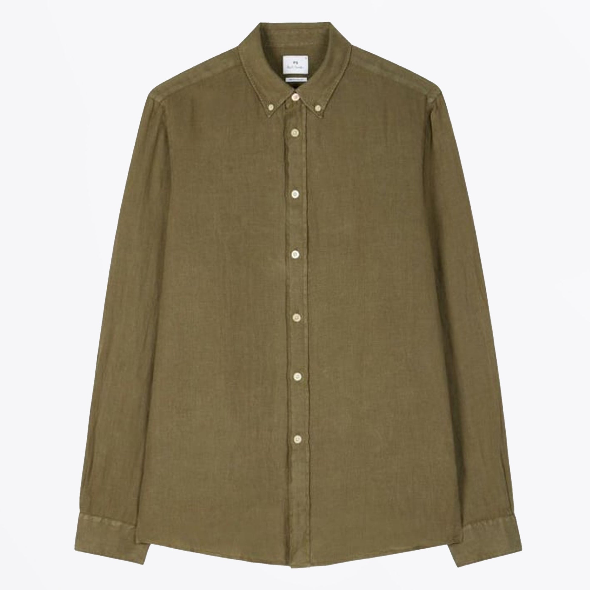 Paul Smith is a distinguished British designer who is renowned for his creative aesthetic, which combines tradition and modernity. Update your wardrobe staples with this option from Paul Smith. This military green shirt features a linen material, collared neckline, beige button up fastening and long sleeves. Wear this with a pair of designer shorts and Birkenstocks