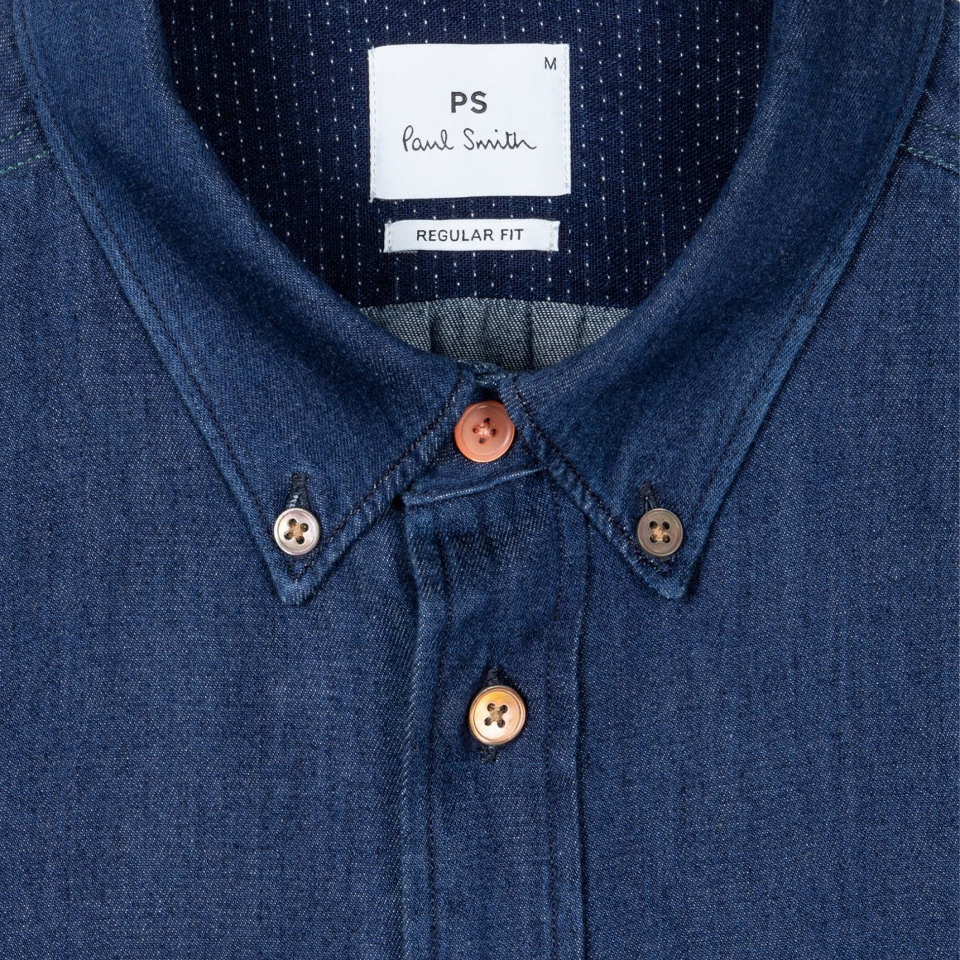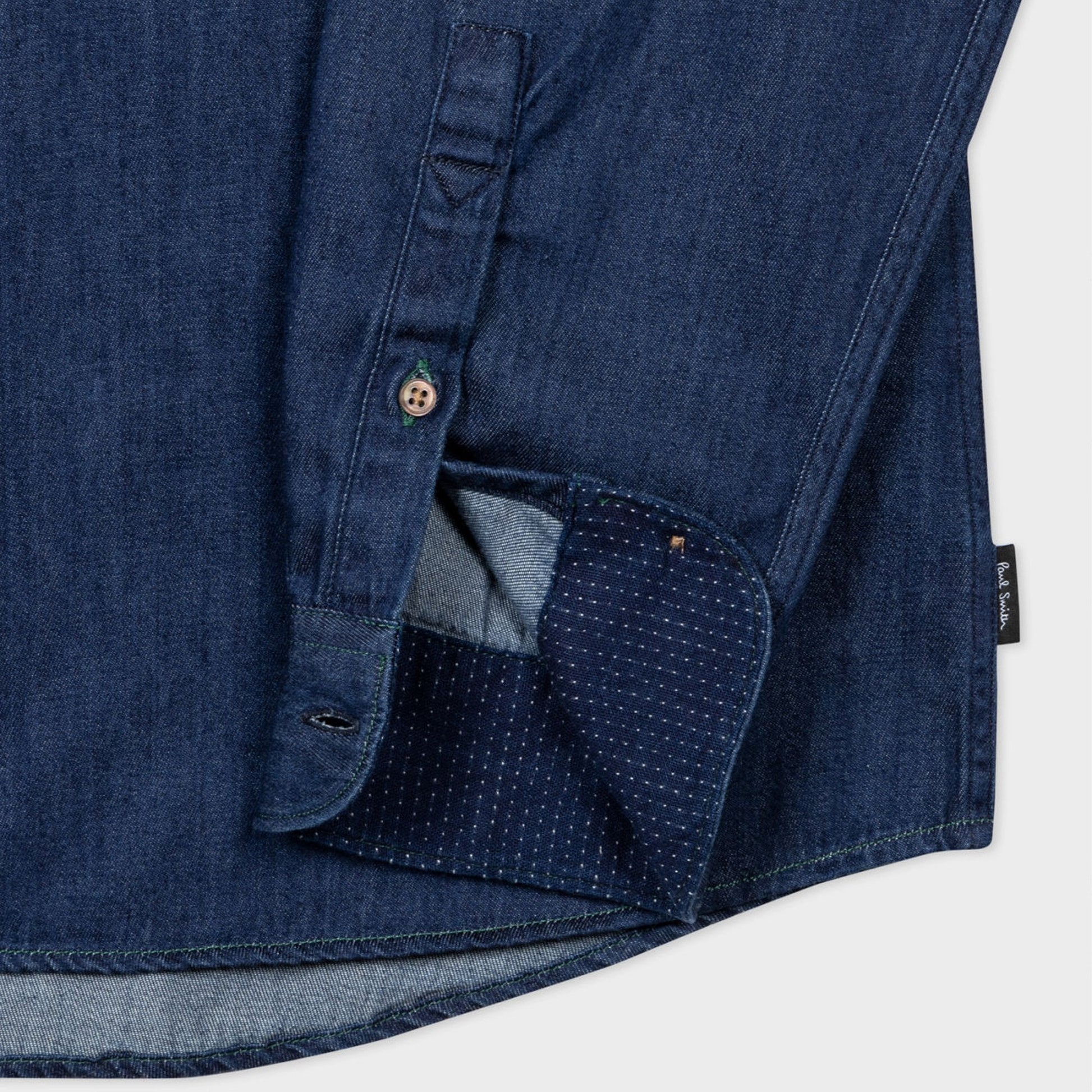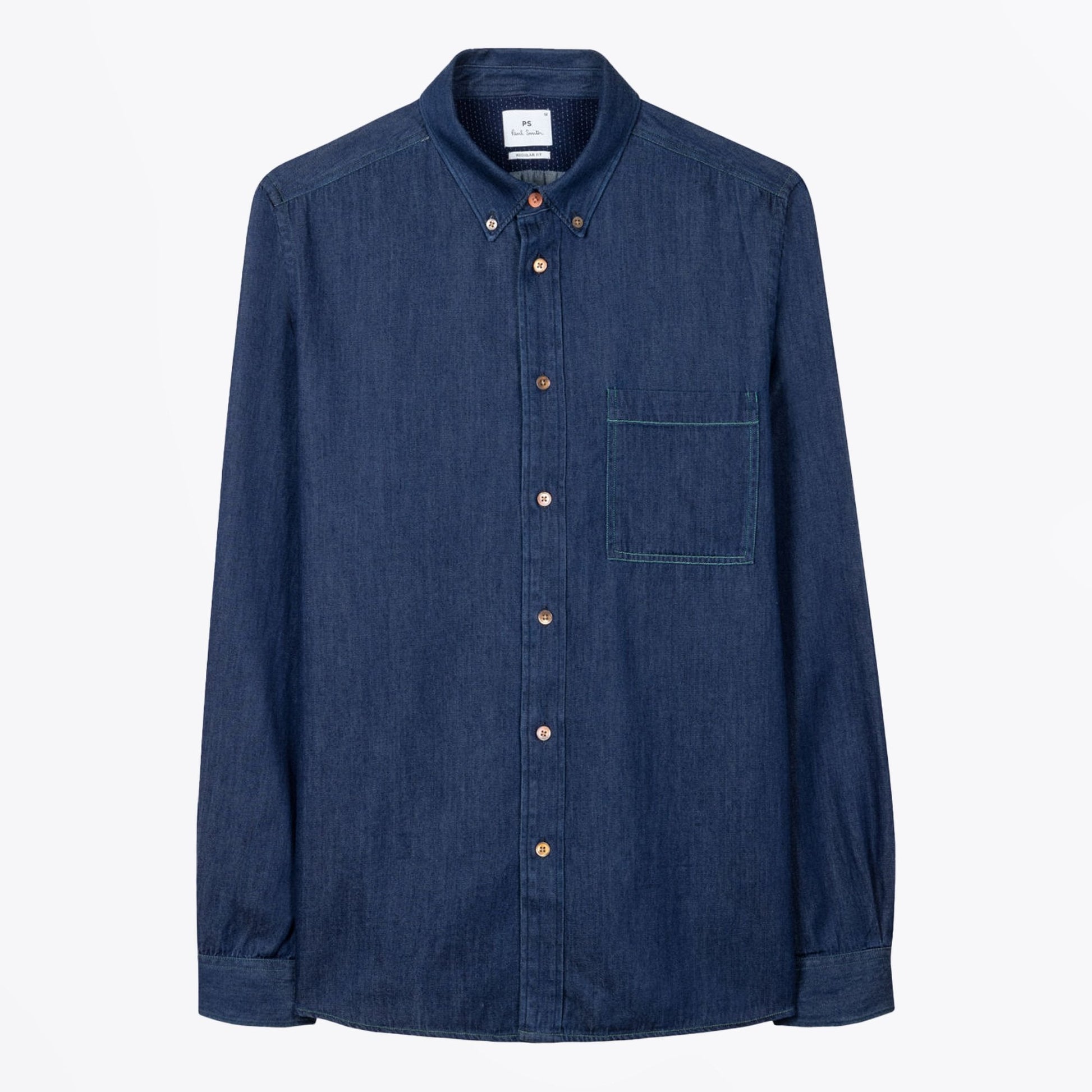 Paul Smith is a distinguished British designer who is renowned for his creative aesthetic, which combines tradition and modernity. Update your casual staples with some designer branding this season.  This denim shirt is crafted in a mid-wash using organic cotton in the composition, and features a button-down fastening, with a buttoned collar, and a contrasting pink button at the top of. This shirt also features a breast patch pocket highlighted with contrasting green topstitching. Wear this shirt with some Universal Works trousers and some designer trainers for a great casual, yet refined look.