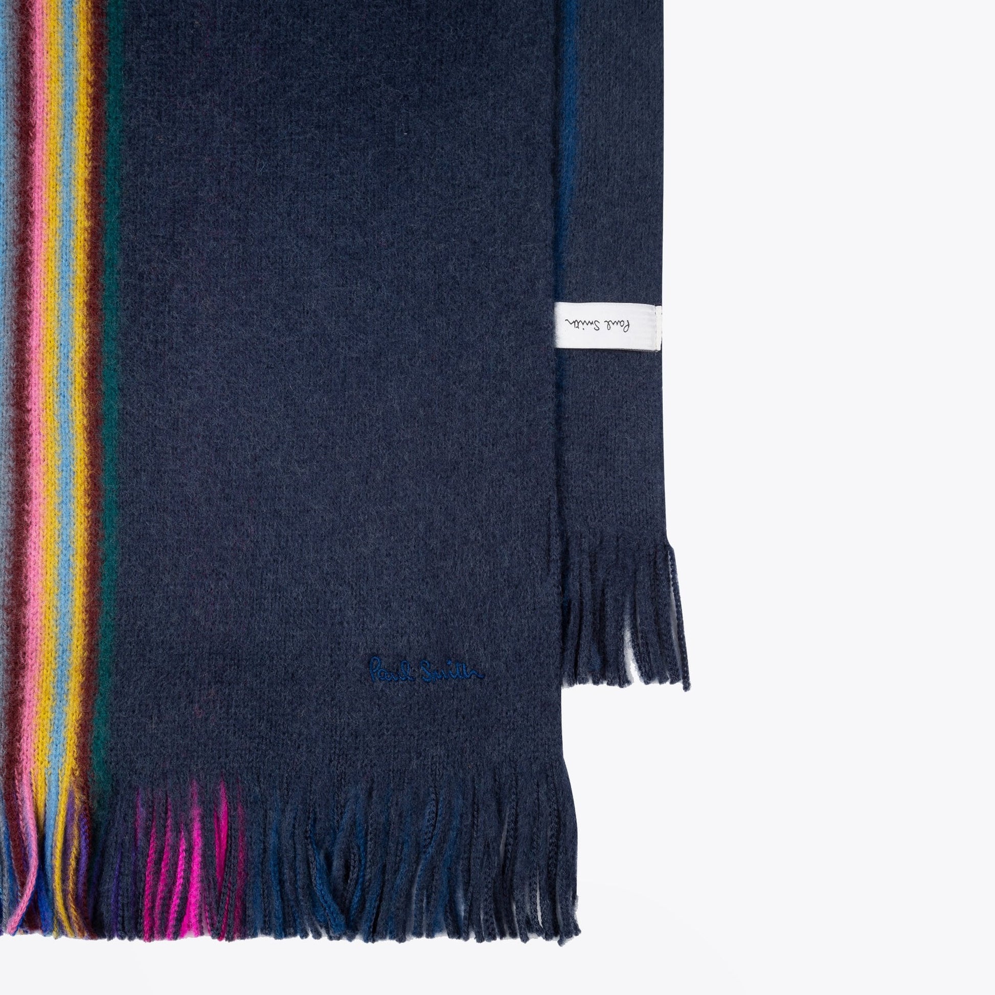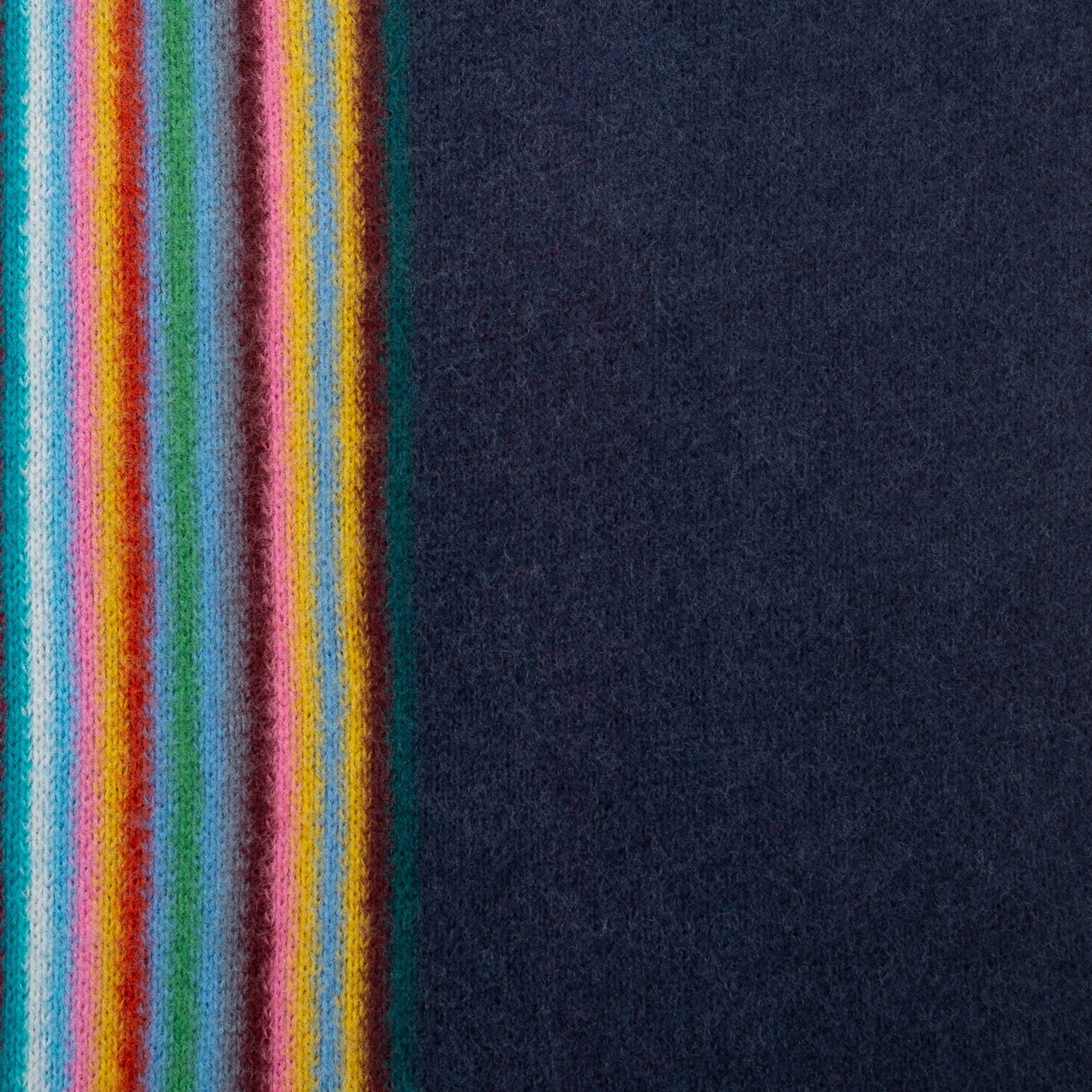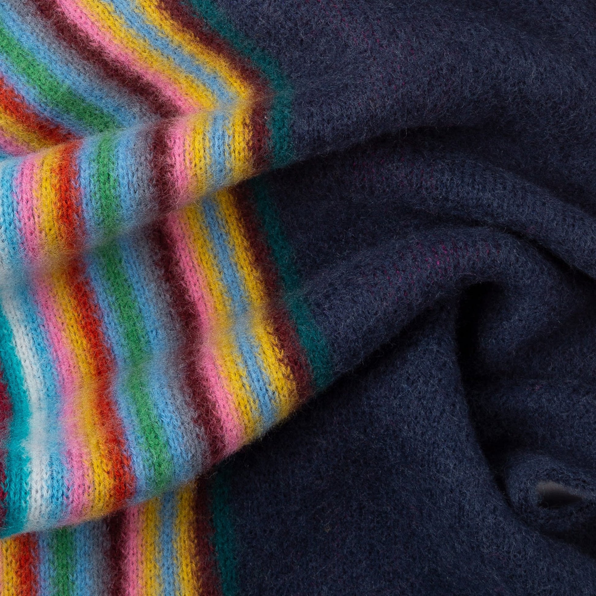 Paul Smith is a distinguished British designer who is renowned for his creative aesthetic, which combines tradition and modernity. Super soft scarf. Crafted from a luxurious 100% wool this navy reversible scarf features multi-coloured stripes at the side with contrast stripes on the reverse side. This classic knitted scarf has been finished with tasselled ends and raw edges and an embroidered Paul Smith signature.