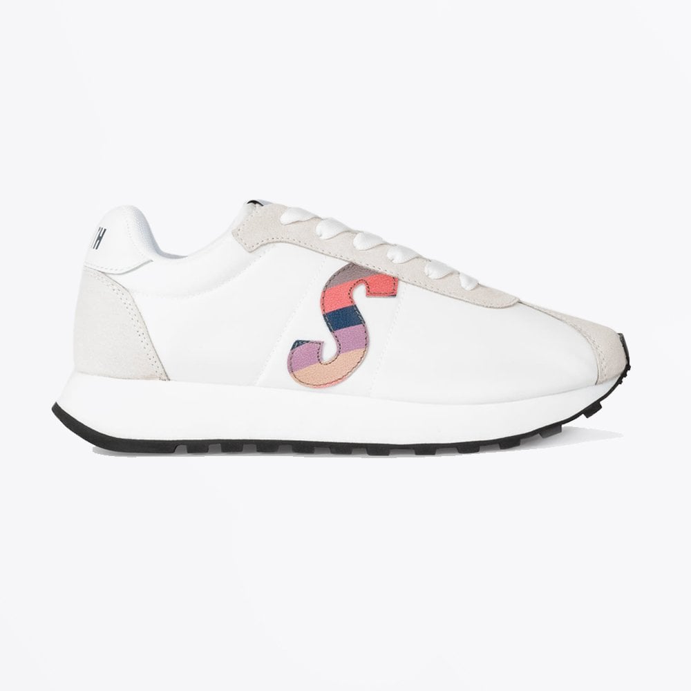 Paul Smith is a distinguished British designer who is renowned for his creative aesthetic, which combines tradition and modernity. Classic with a hint of eclectic is the key element of the company. Made from fabric uppers with tonal suede trims, these white 'Seventies' trainers feature 'Swirl' print leather P and S detailing on either side of the shoe.