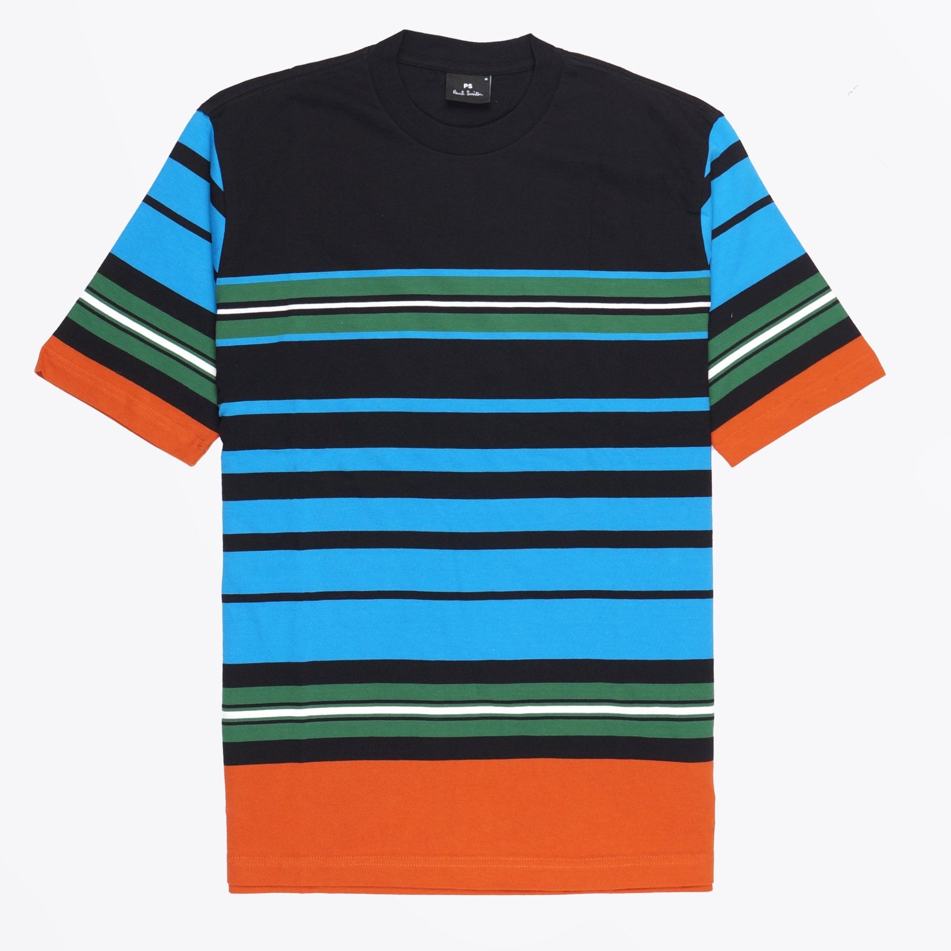 Paul Smith is a distinguished British designer who is renowned for his creative aesthetic, which combines tradition and modernity. Add a touch of luxury to your new season wardrobe with a classic Paul Smith tee. Crafted from an organic cotton material, this tee features a printed stripe design in shades of green, blue and orange on a black base. This t-shirt has a ribbed crew neck and short sleeves. To elevate your daily wardrobe, wear this t-shirt with a pair of straight leg jeans and some designer trainers.