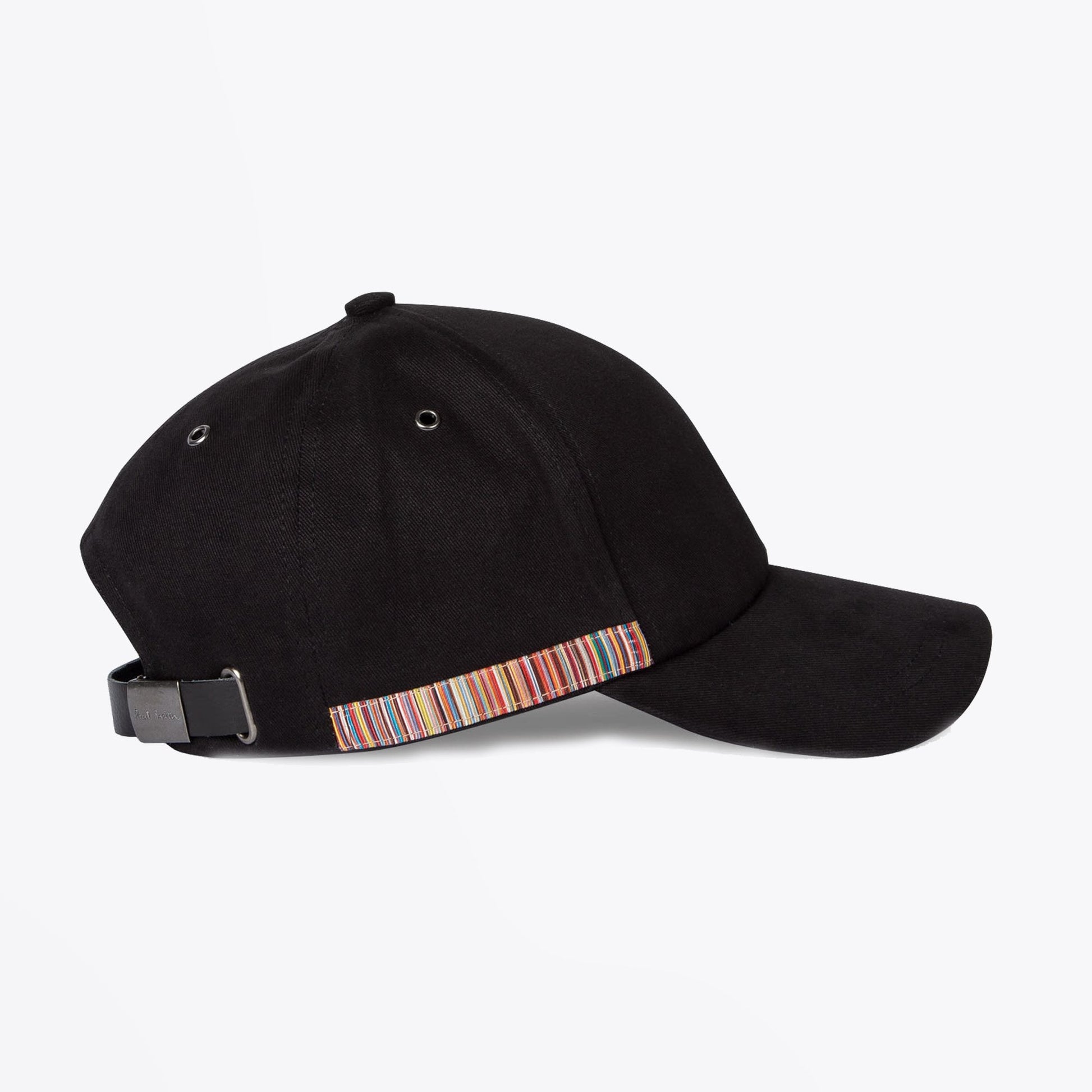 Paul Smith is a distinguished British designer who is renowned for his creative aesthetic, which combines tradition and modernity. This men's black cap featuring 'signature stripe' trim on the side, is a modern wardrobe staple. Crafted in cotton, this cap is finished with black lining and internal band with a silver Paul Smith signature embossed size adjuster.