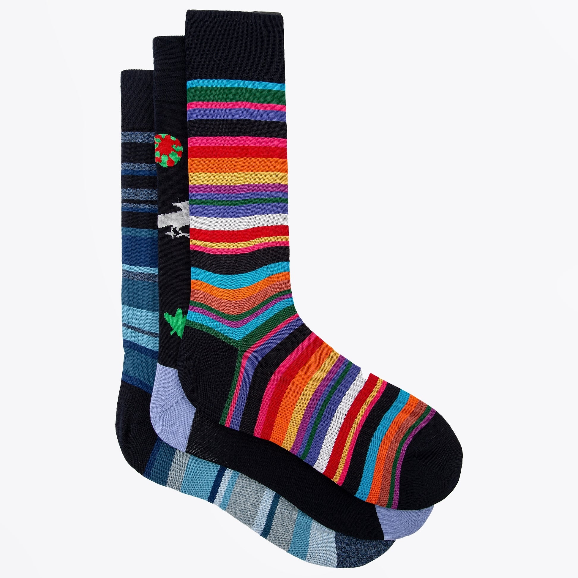 Paul Smith is a distinguished British designer who is renowned for his creative aesthetic, which combines tradition and modernity. Add a touch of designer luxury to your daily wardrobe, with some designer socks. This 3-pack features a variety of patterned socks in with multi-coloured striped designs and whimsical motifs. Wear these socks with a pair of leather shoes to add some fun to your suit attire.