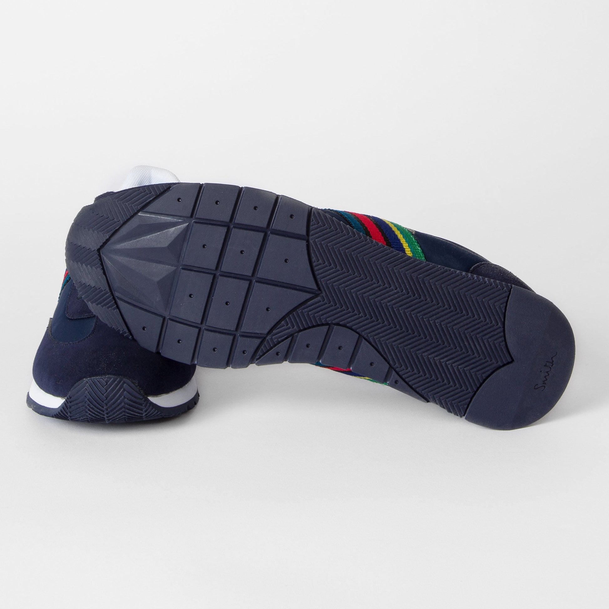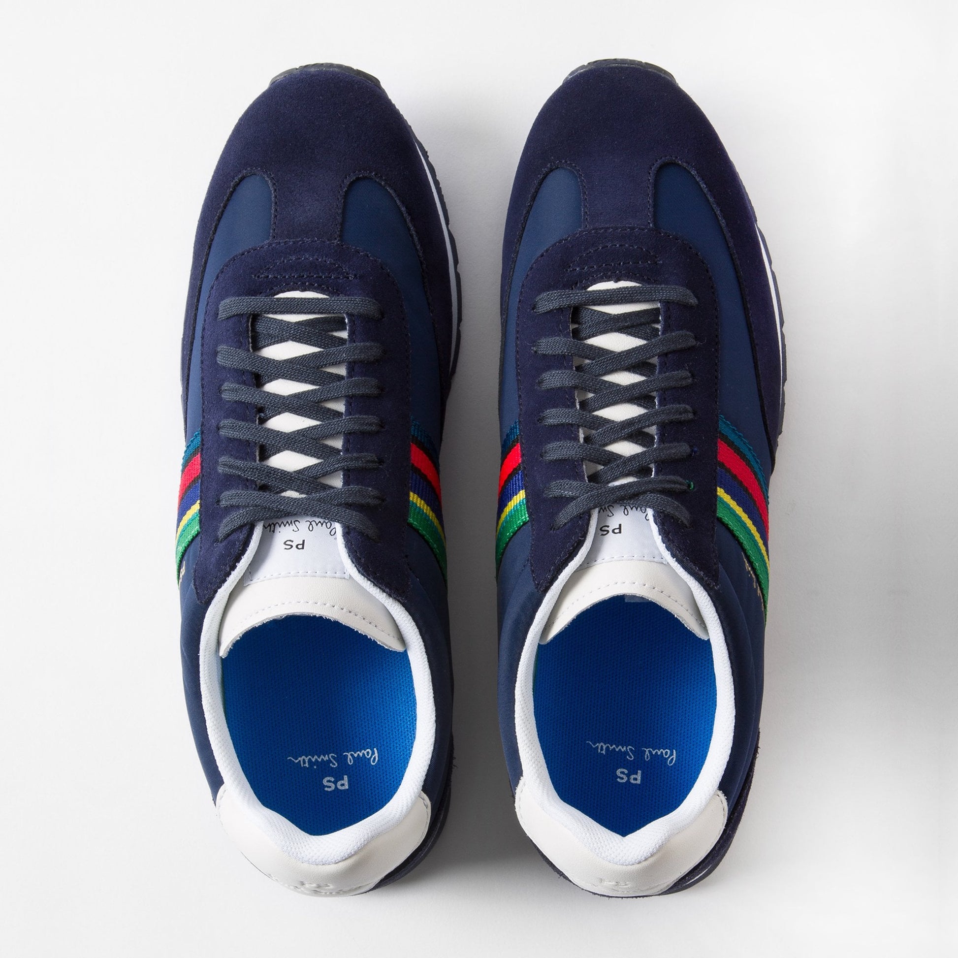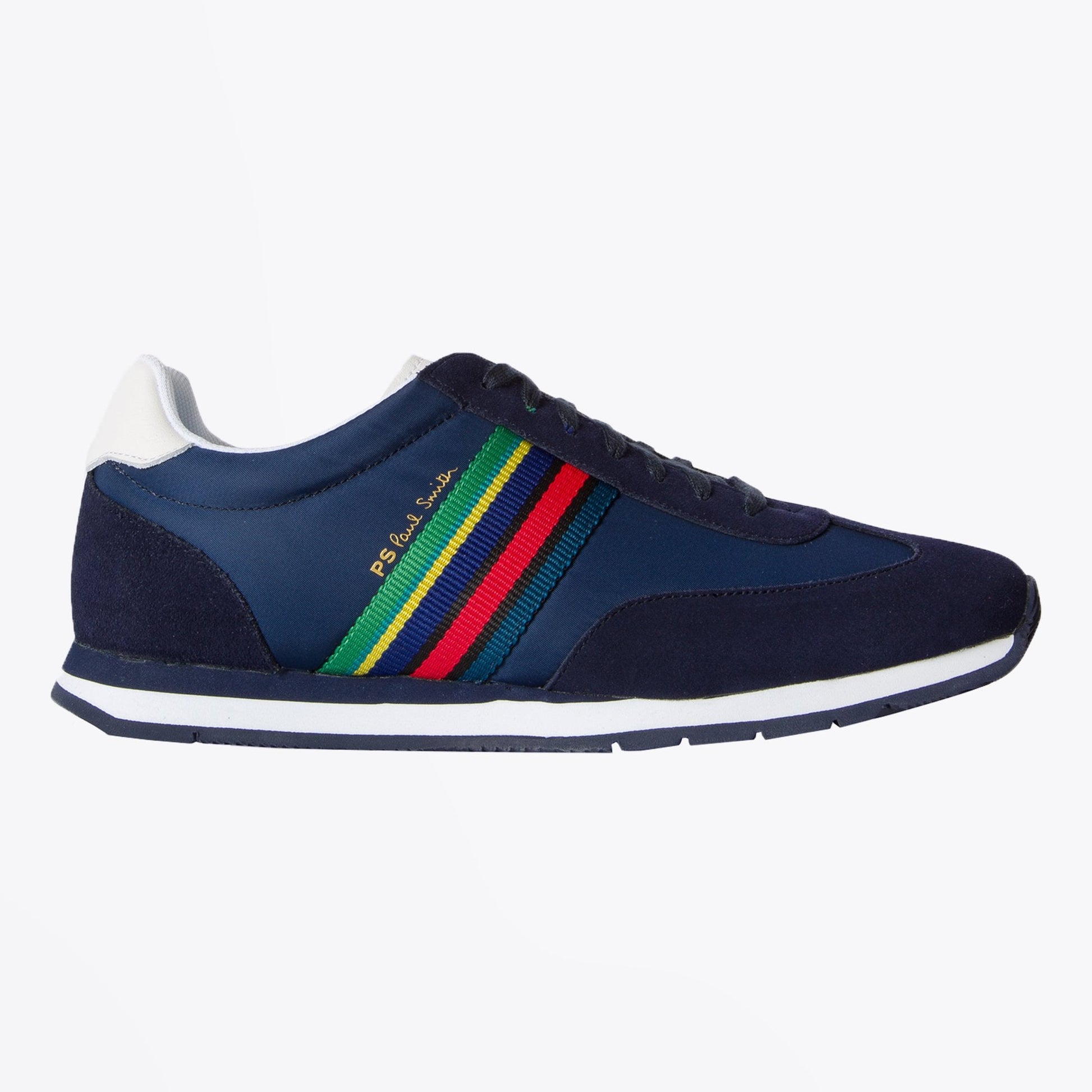 Paul Smith is a distinguished British designer who is renowned for his creative aesthetic, which combines tradition and modernity. Crafted from a smooth nylon with suede panels, these sleek navy 'Prince' trainers are adorned with gold embossed foil Paul Smith's signature on the outer sides. These lightweight trainers are finished off with a sports stripe webbing on both sides and white leather heel trims with PS Paul Smith embossed.