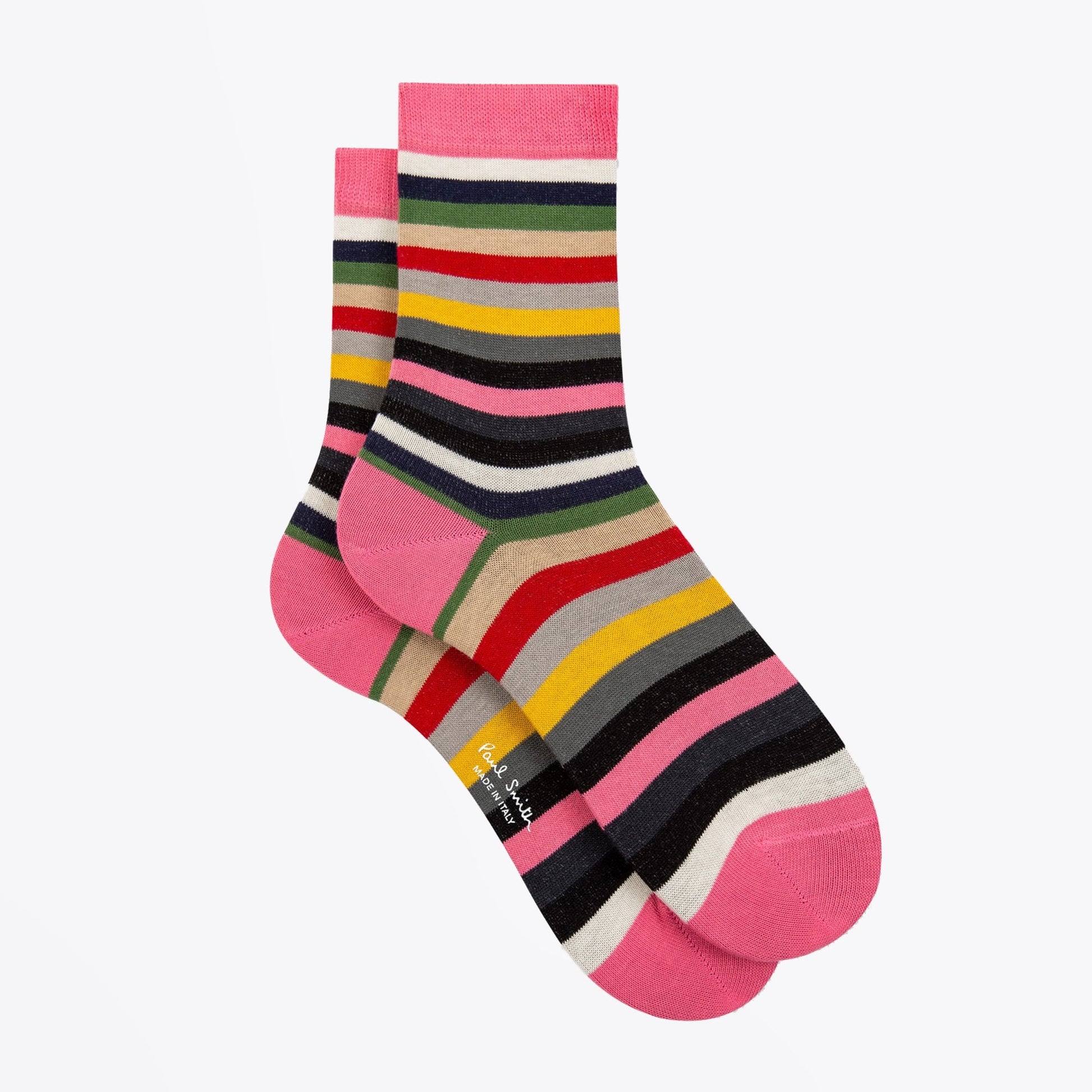 Paul Smith is a distinguished British designer who is renowned for his creative aesthetic, which combines tradition and modernity. Classic with a hint of eclectic is the key element of the company. Italian made soft cotton blend socks with added stretch for comfort. These colourful stripe socks in blue, white, green, red and yellow have been finished with tonal ribbed cuffs.