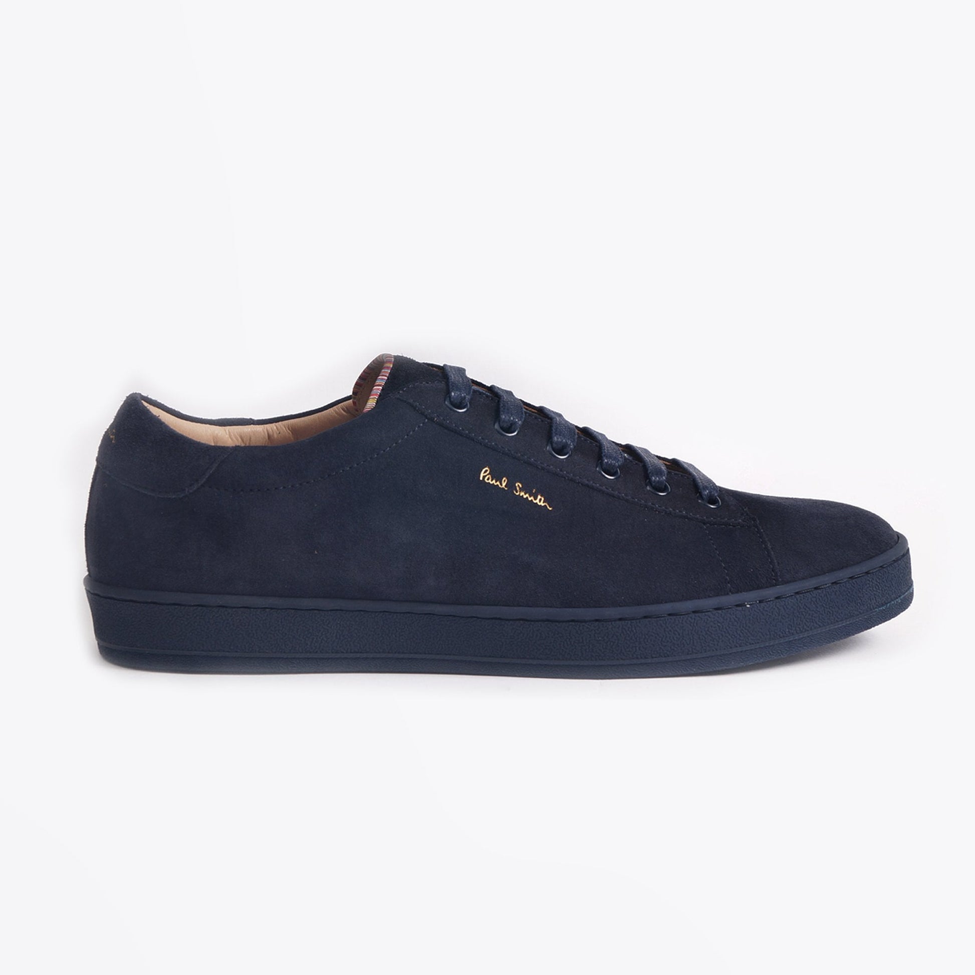 Paul Smith is a distinguished British designer who is renowned for his creative aesthetic, which combines tradition and modernity. Crafted in Italy from a premium suede leather, these dark navy 'Hassler' trainers are adorned with a classic design and have tonal rubber cupsoles with a foil embossed 'Paul Smith' logo on the heel and footbeds. This classic style has been expertly finished with a textured midsole and logo embossed outsole and signature stripe tongue trim. A classic style that is perfectly matched with both casual and tailored outfits, these trainers are finished with gold foil embossed PS signature on the side.