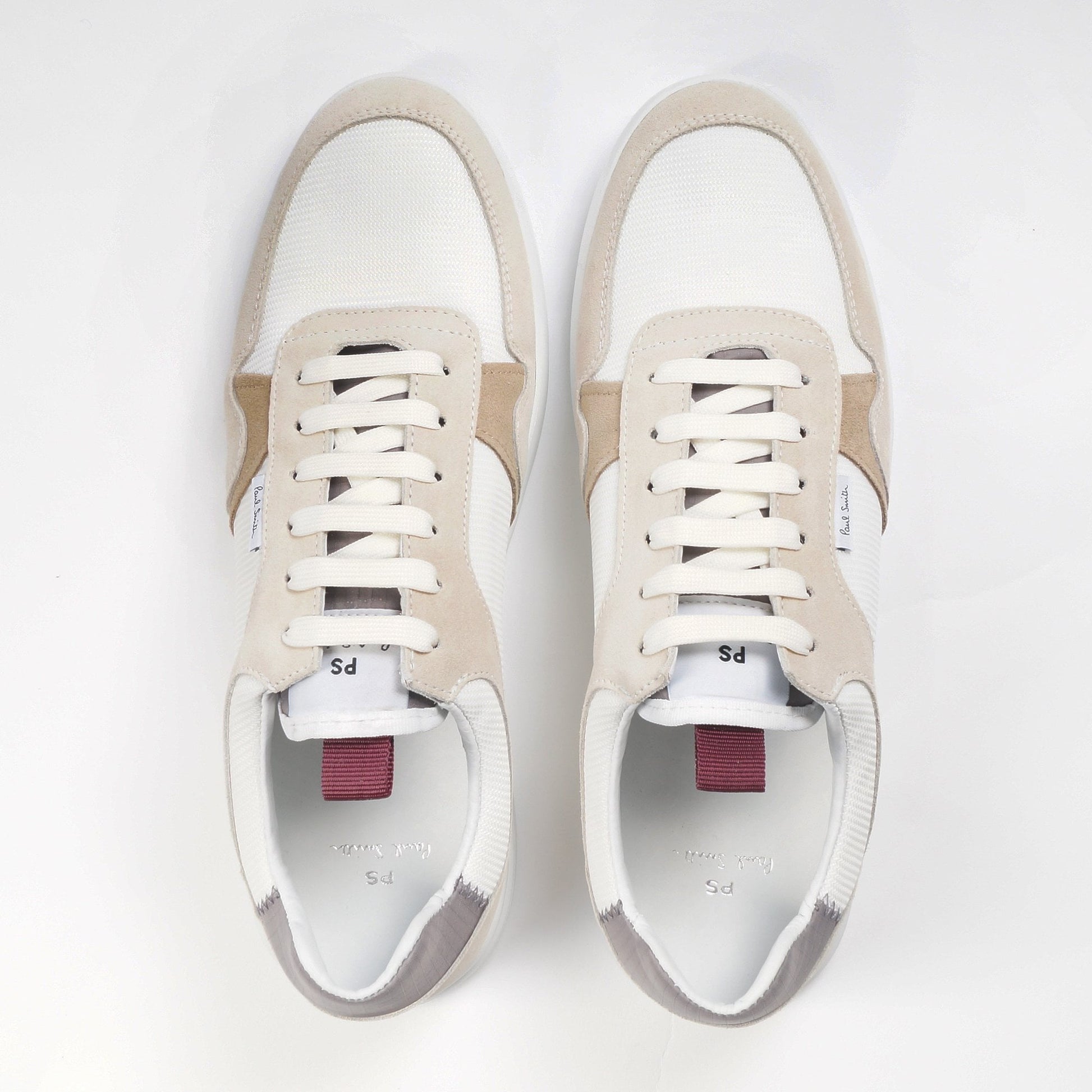 Paul Smith is a distinguished British designer who is renowned for his creative aesthetic, which combines tradition and modernity. Crafted from smooth suede panels with mesh fabric detailing, these sleek white and beige 'Lemmy' trainers are adorned with Paul Smith embossed logo on the rubber cupsoles on the heel. These lightweight trainers are finished off with stitch detailing and PS tongue branding with tab.