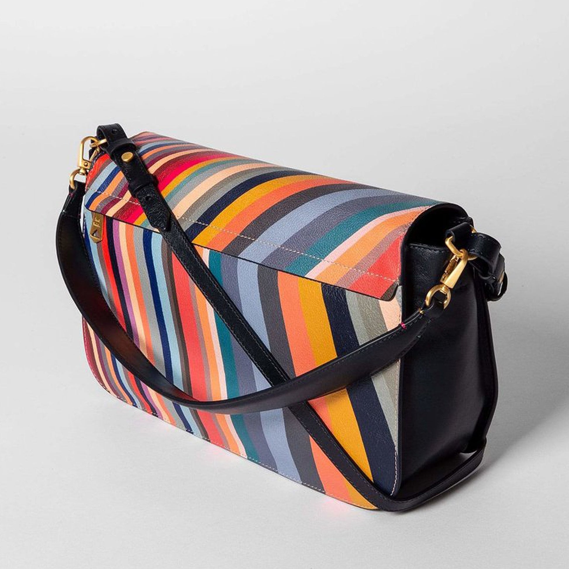 Paul Smith is a distinguished British designer who is renowned for his creative aesthetic, which combines tradition and modernity. Classic with a hint of eclectic is the key element of the company. This textured leather multi-coloured saddle bag features a 'Swirl' print throughout with a main mag-dot closure. This classic handbag also offers a detachable shoulder strap,  a concealed slip pocket ideal for receipts, tickets and gold-foil Paul Smith signature on the exterior.