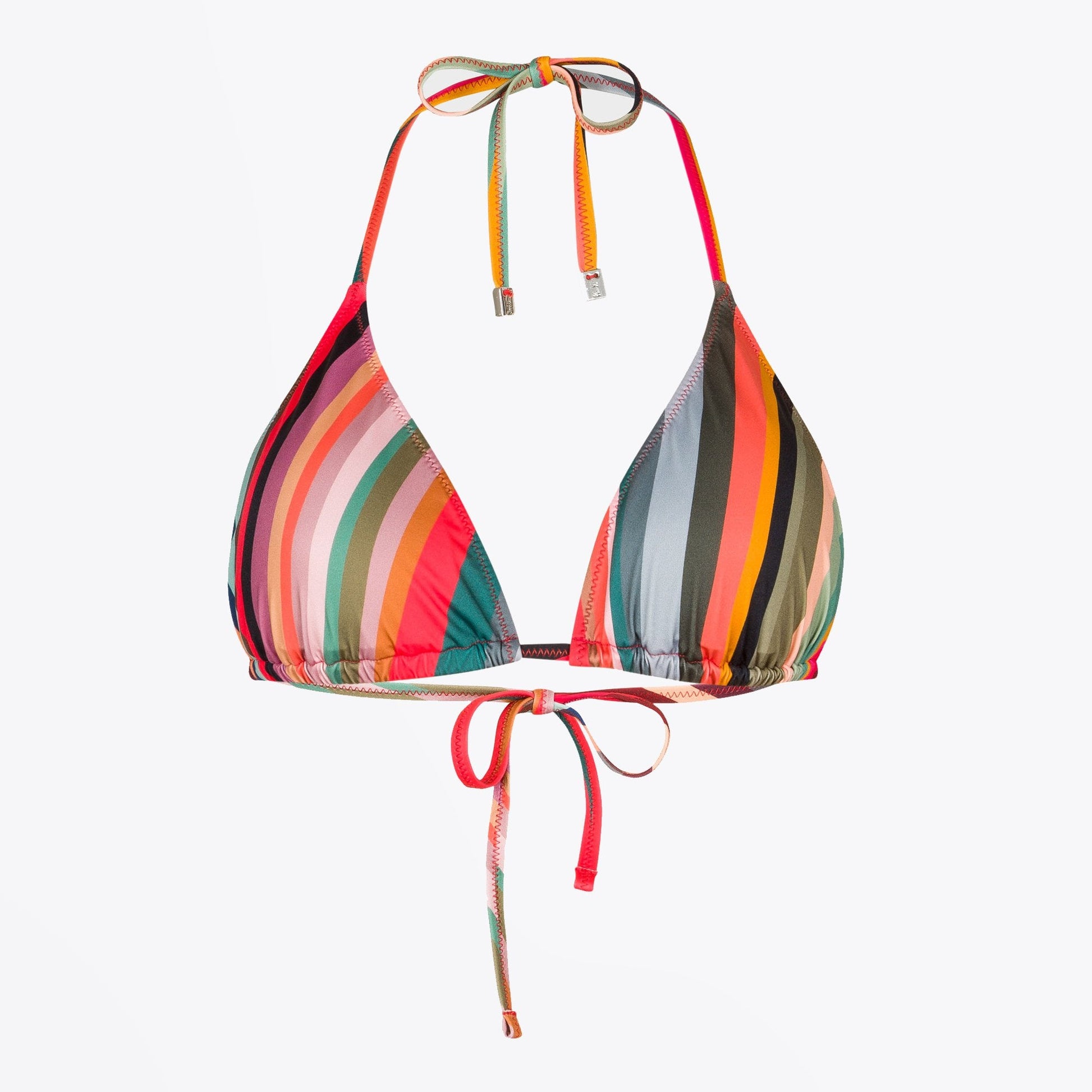 Paul Smith is a distinguished British designer who is renowned for his creative aesthetic, which combines tradition and modernity. Classic with a hint of eclectic is the key element of the company. Featuring a vibrant 'swirl' print, this bikini top is the perfect holiday accessory. Comfortable and lightweight this summery piece of swimwear features a removable slight padded cup, fuchsia lining and Paul Smith embossed hardware. Team this bikini top with the matching bottoms for an on-trend look on the beach or by the poolside this summer!