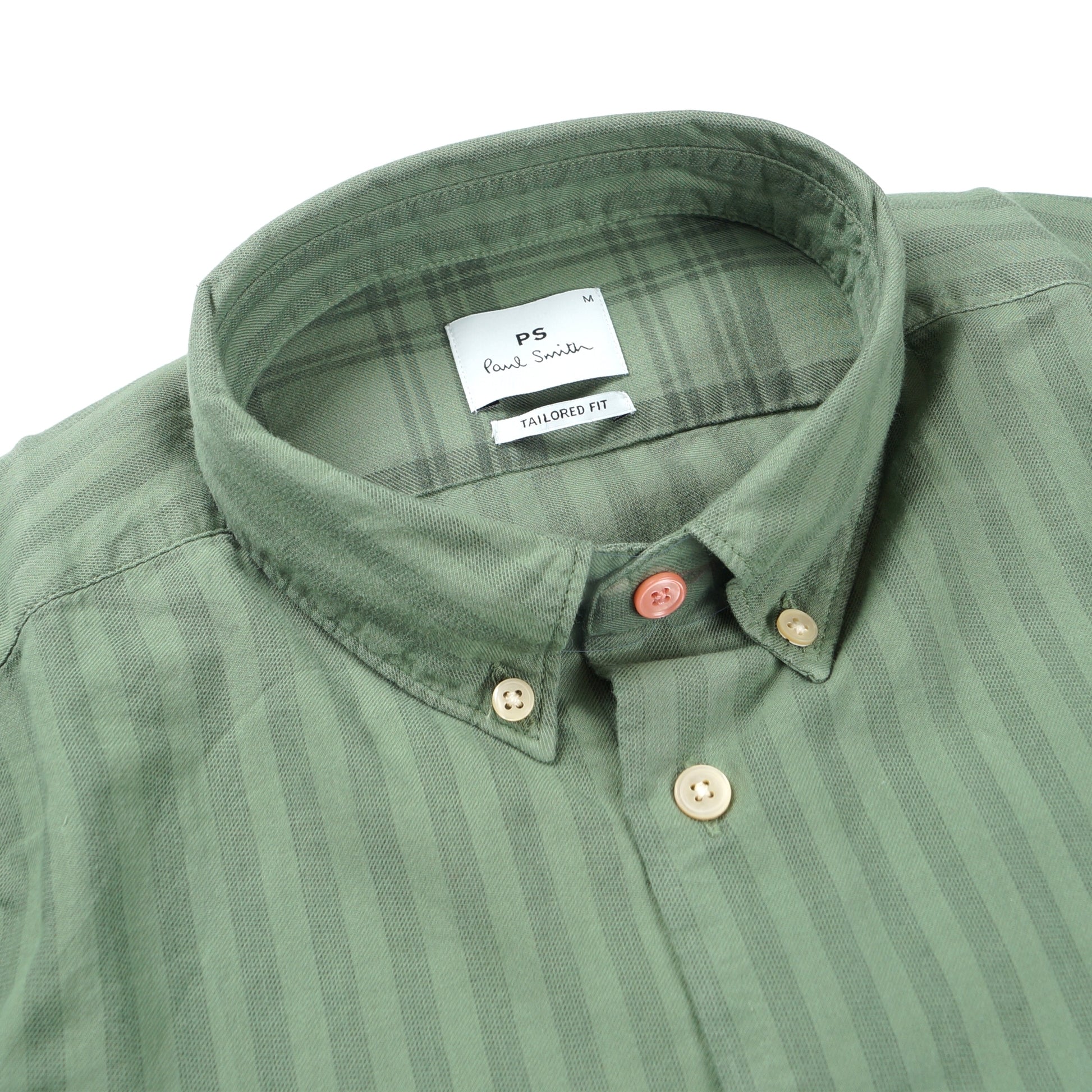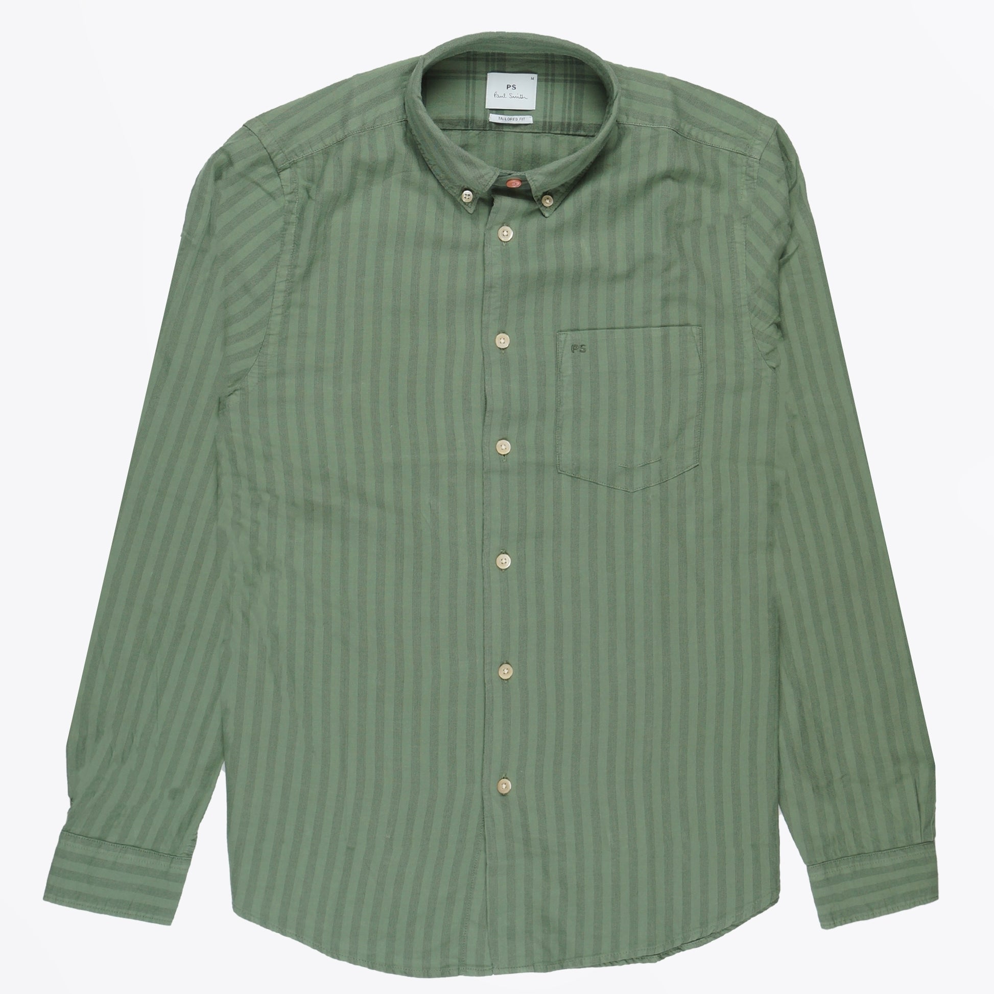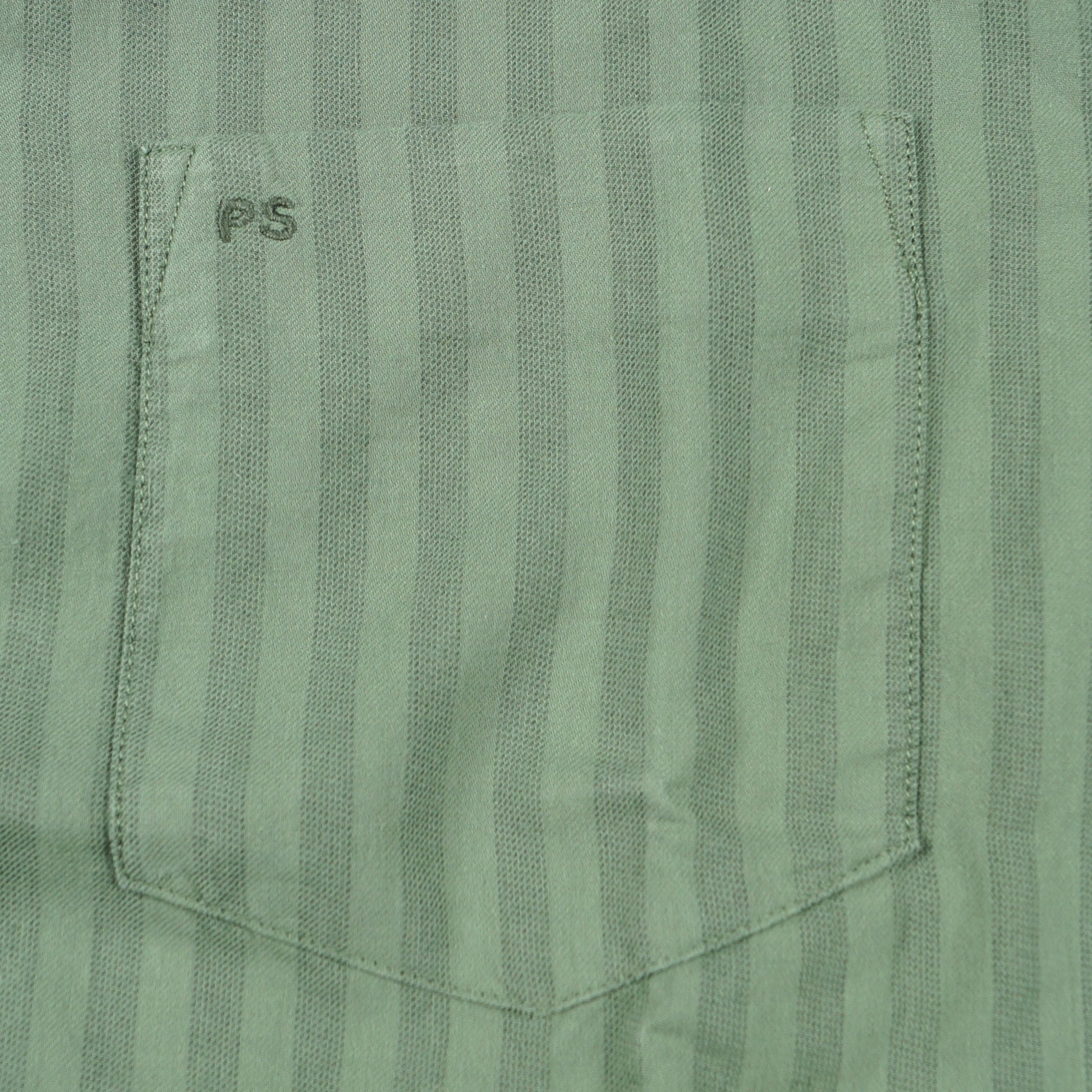 Paul Smith is a distinguished British designer who is renowned for his creative aesthetic, which combines tradition and modernity. Update your wardrobe staples with this option from Paul Smith. This green shirt features a button-down fastening, collared neckline, buttoned cuffs, and a faint stripe pattern design. Wear this shirts with a pair of designer jeans and Paul Smith trainers.