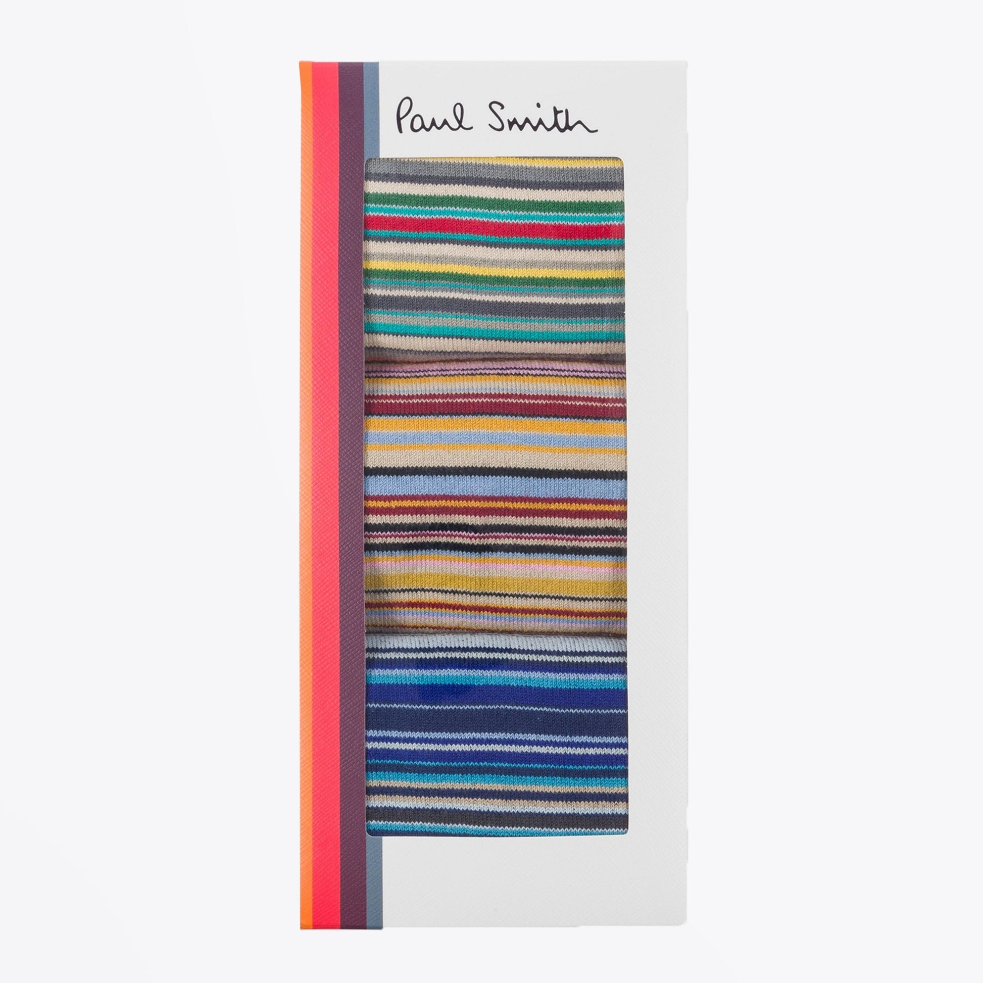 Paul Smith is a distinguished British designer who is renowned for his creative aesthetic, which combines tradition and modernity. Made in England, this three pack of socks are crafted in a soft cotton blend. These socks feature a variety of multi-coloured stripes and are finished with ribbed cuffs and are presented in a black gift box.