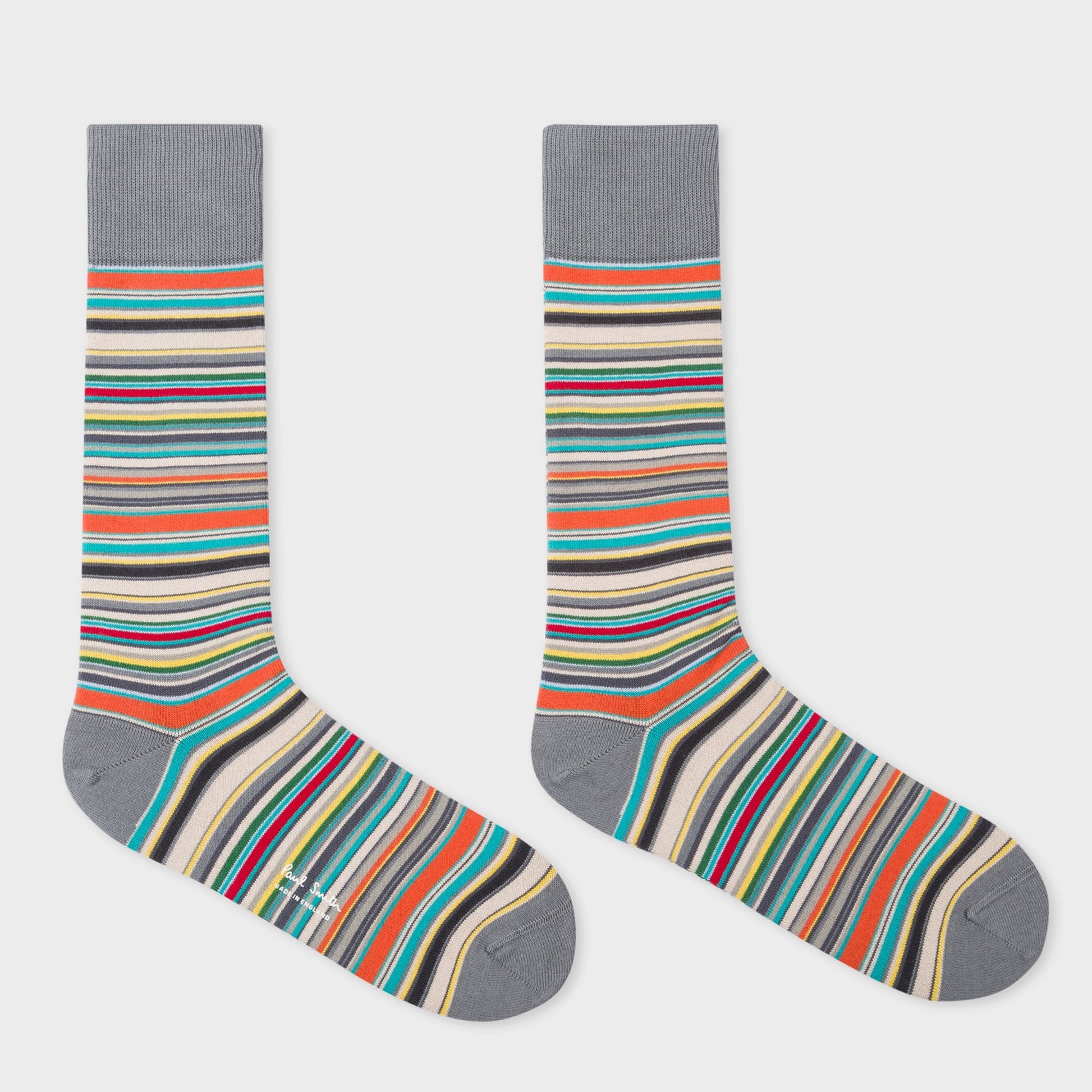 Paul Smith is a distinguished British designer who is renowned for his creative aesthetic, which combines tradition and modernity. Made in England, this three pack of socks are crafted in a soft cotton blend. These socks feature a variety of multi-coloured stripes and are finished with ribbed cuffs and are presented in a black gift box.