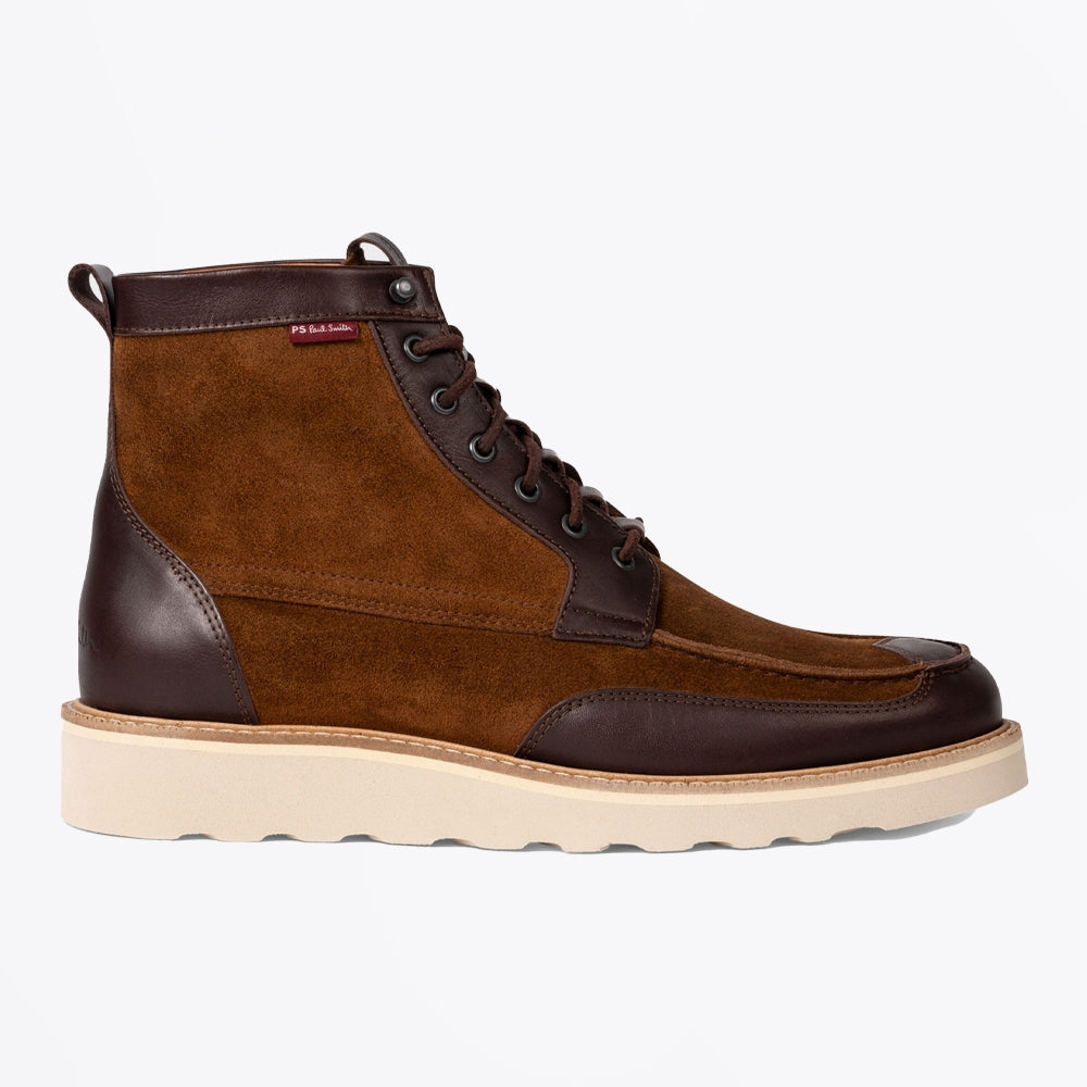 Paul Smith is a distinguished British designer who is renowned for his creative aesthetic, which combines tradition and modernity. Update your wardrobe staples with this option from Paul Smith. This boot features a dark tan suede uppers, dark brown premium leather trims, lace up fastening and a signature Paul Smith logo tab. Wear these boots with a pair of designer jeans and Paul smith top.