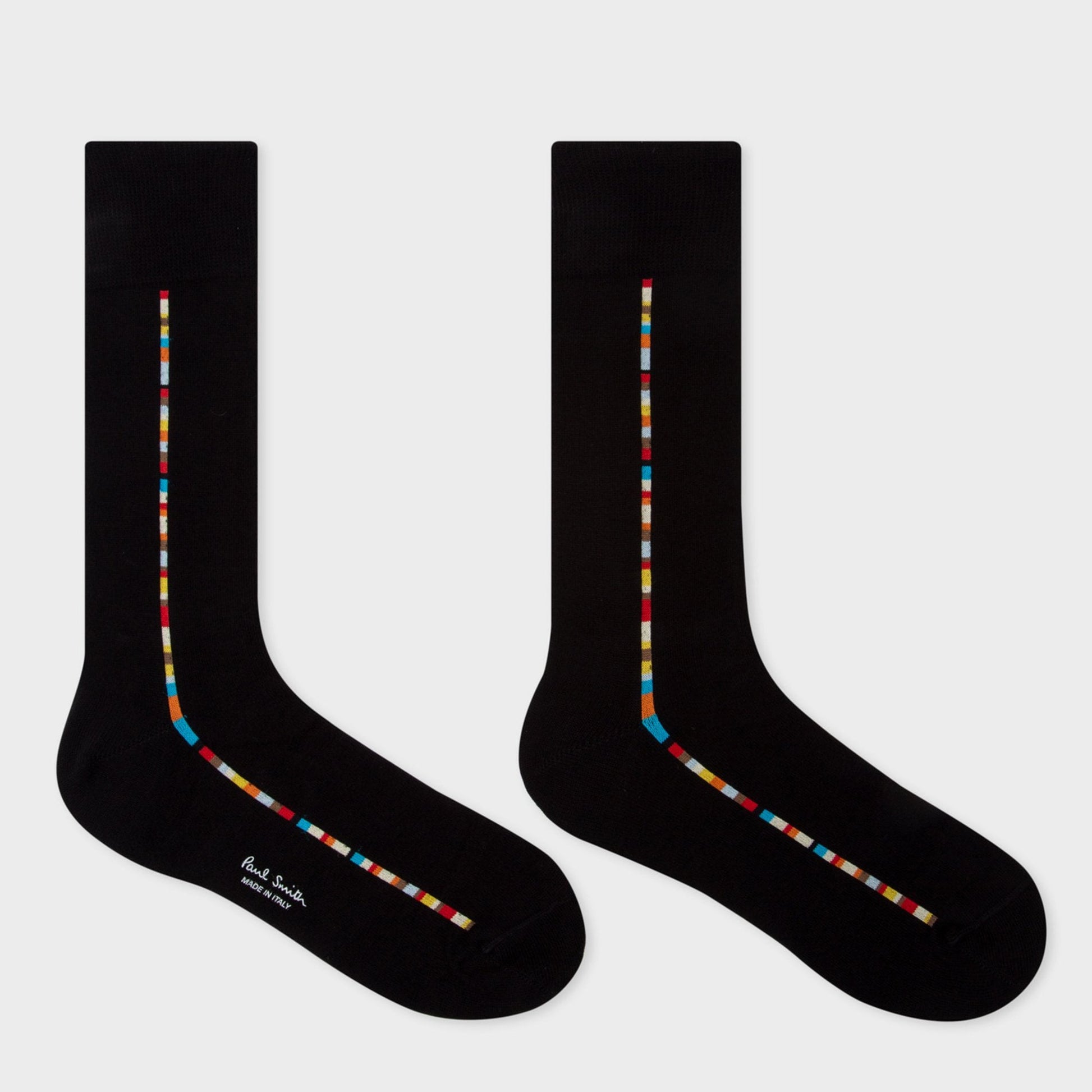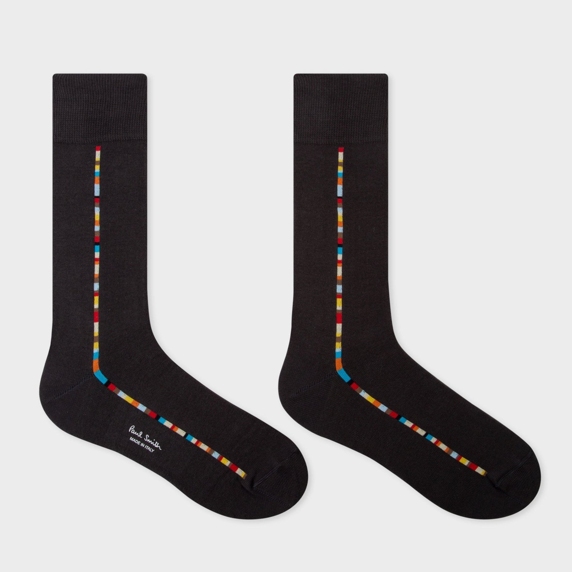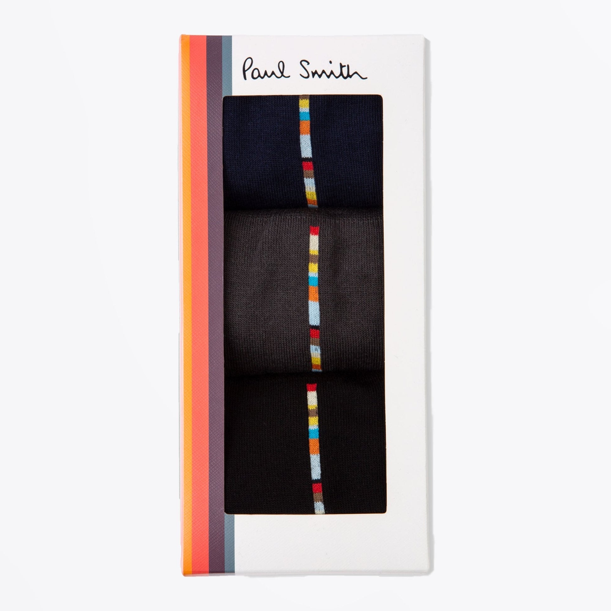 Paul Smith is a distinguished British designer who is renowned for his creative aesthetic, which combines tradition and modernity. These socks feature the iconic Paul Smith stripe down the side of the sock, with the Paul Smith logo at the base of the foot. This trio of socks come in a navy, black and grey pair. Wear these socks with a pair of Paul Smith trainers.