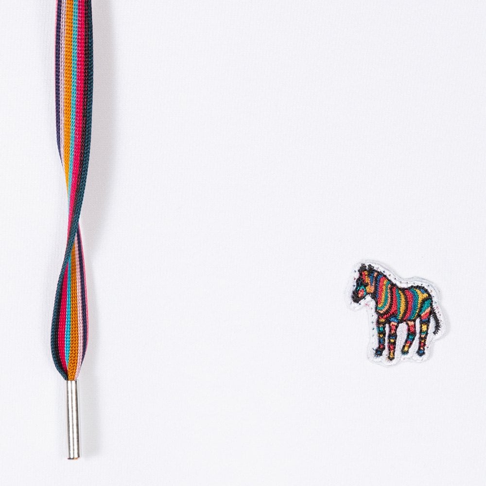 Paul Smith is a distinguished British designer who is renowned for his creative aesthetic, which combines tradition and modernity. Classic with a hint of eclectic is the key element of the company. Constructed from a premium 100% organically grown loopback-cotton, this white women's mid-weight hooded sweatshirt features an embroidered 'Zebra' logo on the chest in 'Swirl' colours. This hoodie is finished with striped drawstring-adjustable hood, large front pocket and ribbed cuffs and waistband.