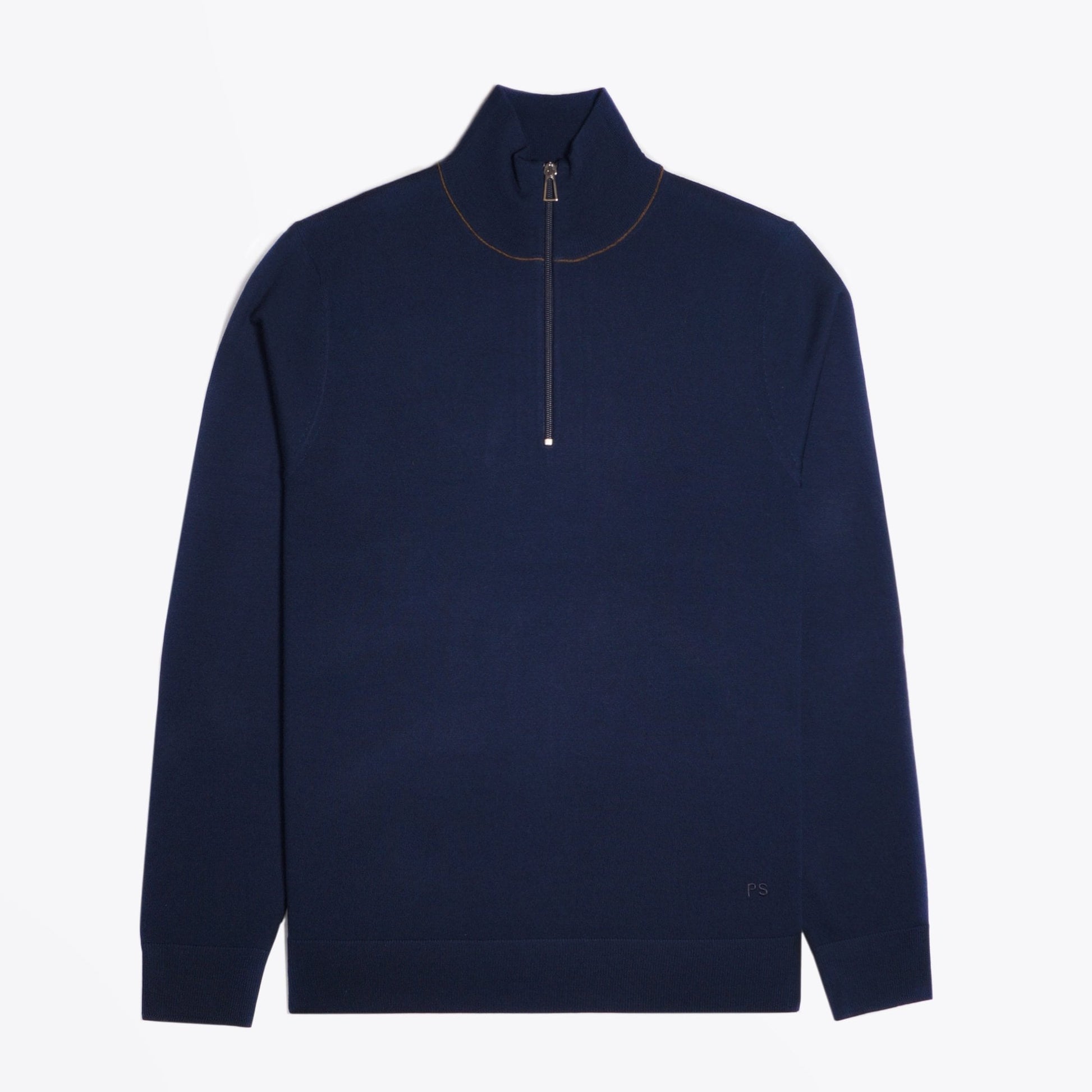Paul Smith is a distinguished British designer who is renowned for his creative aesthetic, which combines tradition and modernity. This long-sleeve dark navy half-zip front pullover is crafted from a super-soft, lightweight merino wool and features a funnel neck with a orange trim around the neckline. Cut for a regular fit this classic understated piece is finished with ribbed cuffs and waistband. The perfect example of comfort.