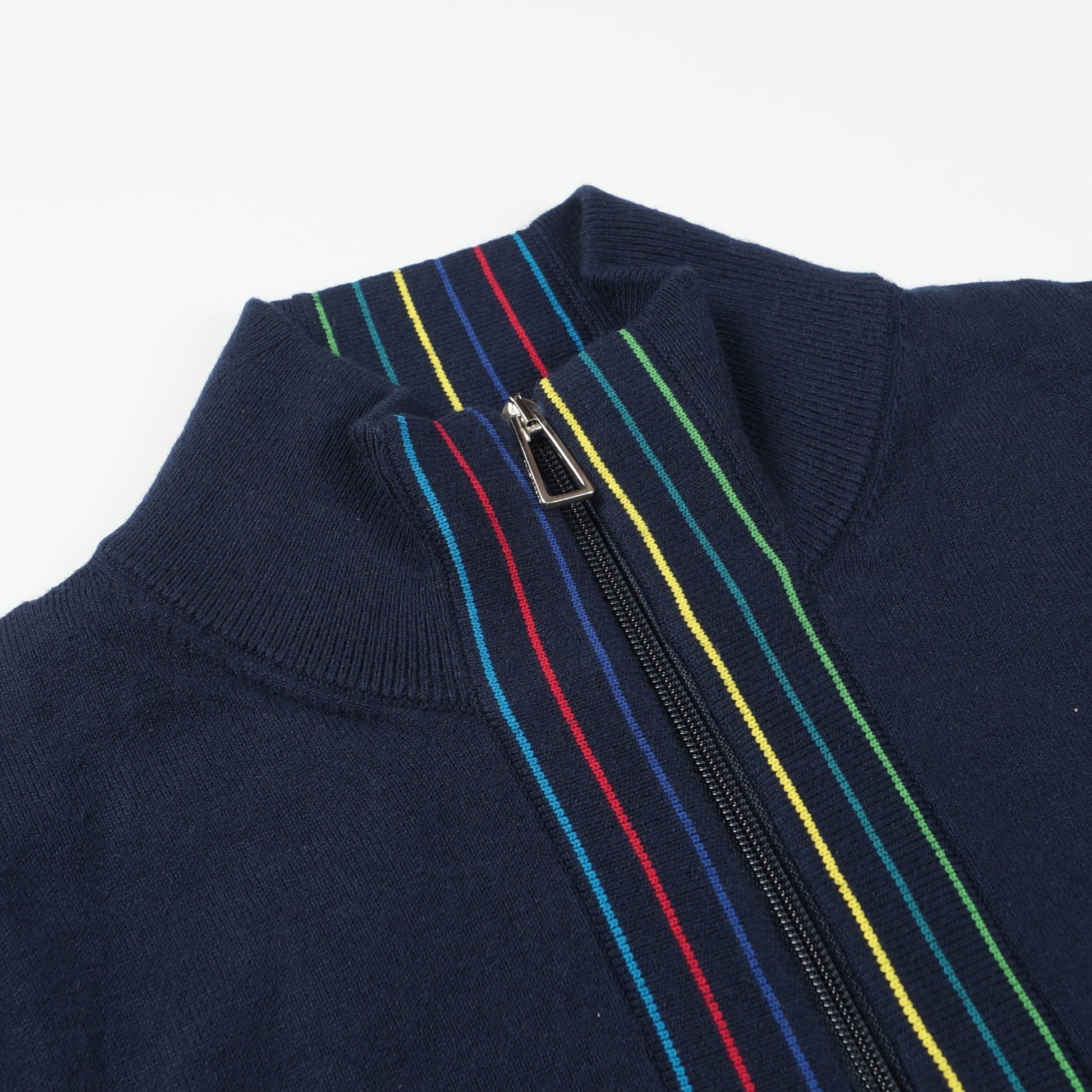 Paul Smith is a distinguished British designer who is renowned for his creative aesthetic, which combines tradition and modernity. Update your wardrobe staples with this option from Paul Smith. This navy cardigan features a signature colour stripe down the centre, zip fastening, long sleeves, ribbed hem and cuffs. Wear this cardigan with a pair of designer jeans and Hoff trainers for a casual weekend look.
