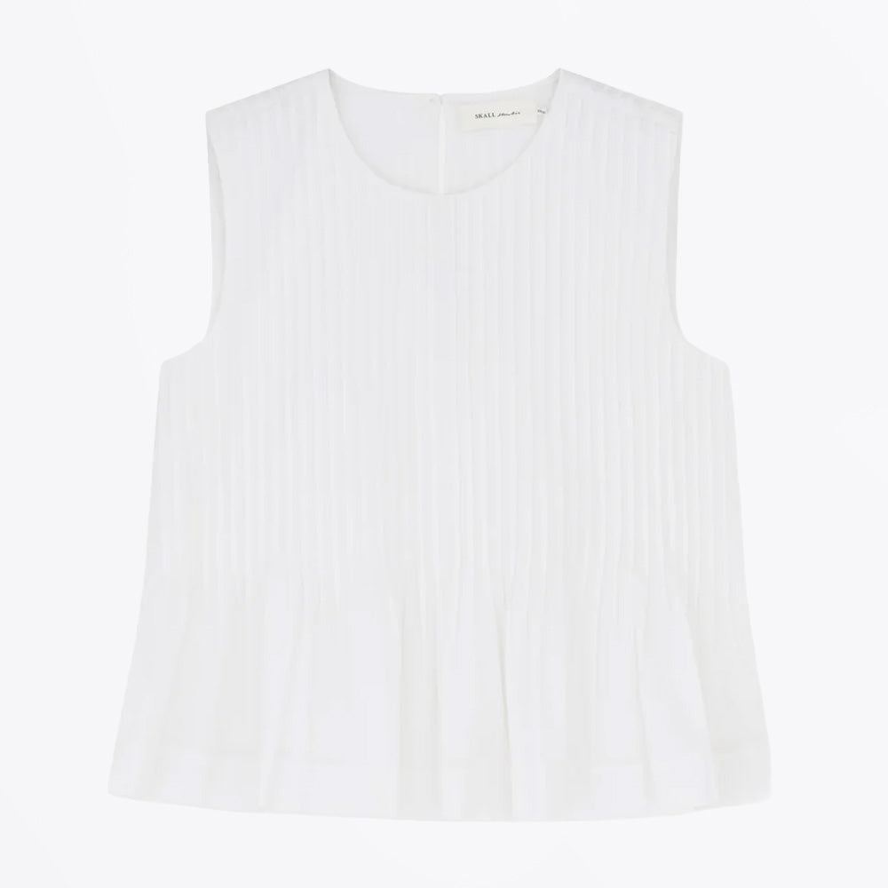 Effortless elegance meets sustainable style with this sleeveless Pavlova Top. Crafted from GOTS-certified organic cotton poplin, it features a classic round neckline and strategic pintucks that create beautiful volume and movement. A discreet back button closure adds refined detail. Perfect for layering or wearing solo, this versatile piece combines comfort with conscious craftsmanship. Produced in India using eco-friendly practices. Machine wash at 30°C.