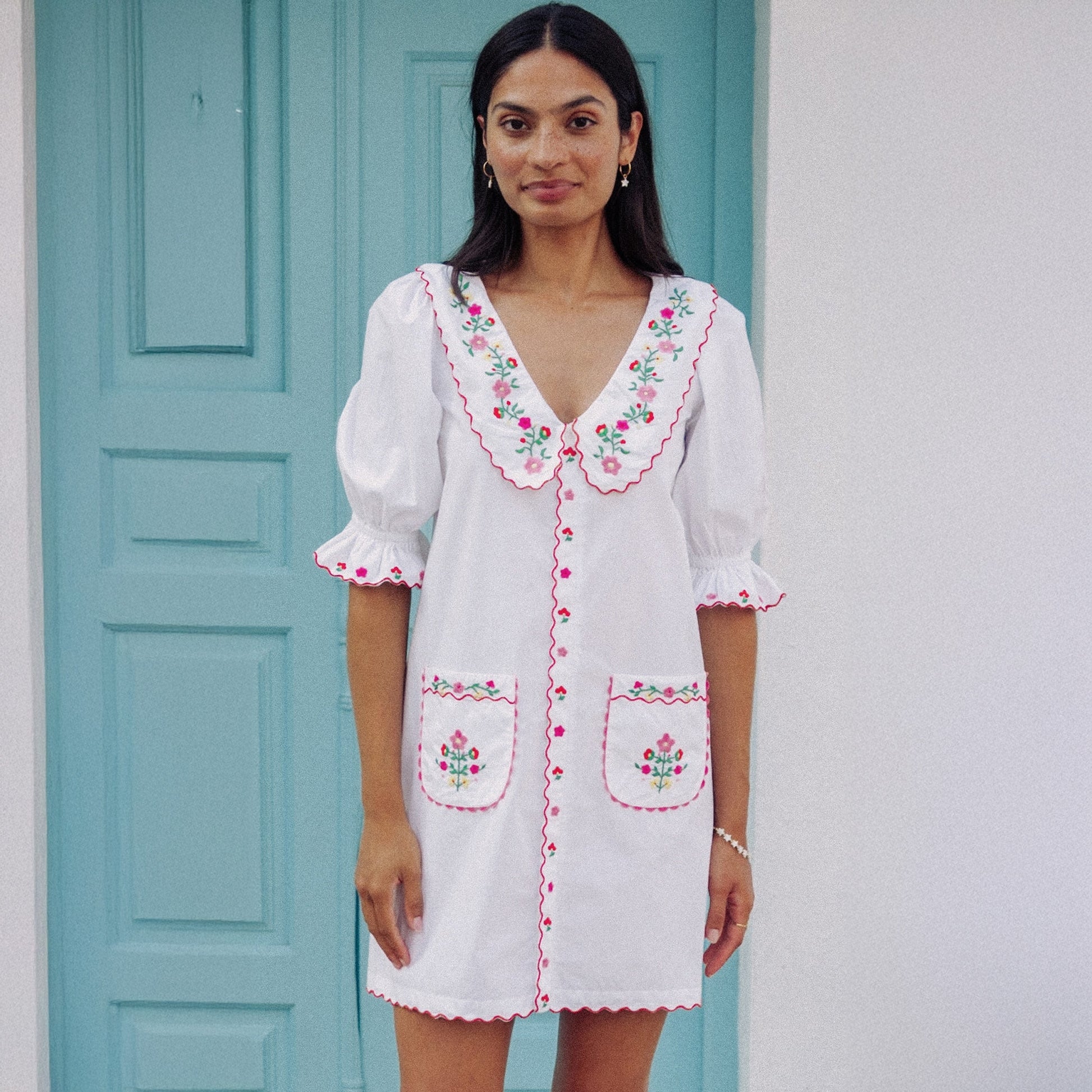 A fresh take on a classic favorite, the Ava Mini Dress is the perfect springtime staple. Designed in a breezy mini length, this effortlessly stylish dress features a flattering open V-neckline and a charming statement ruffled collar, adding a playful yet elegant touch to your wardrobe. Ideal for warm weather, it combines comfort with a timeless, chic look.