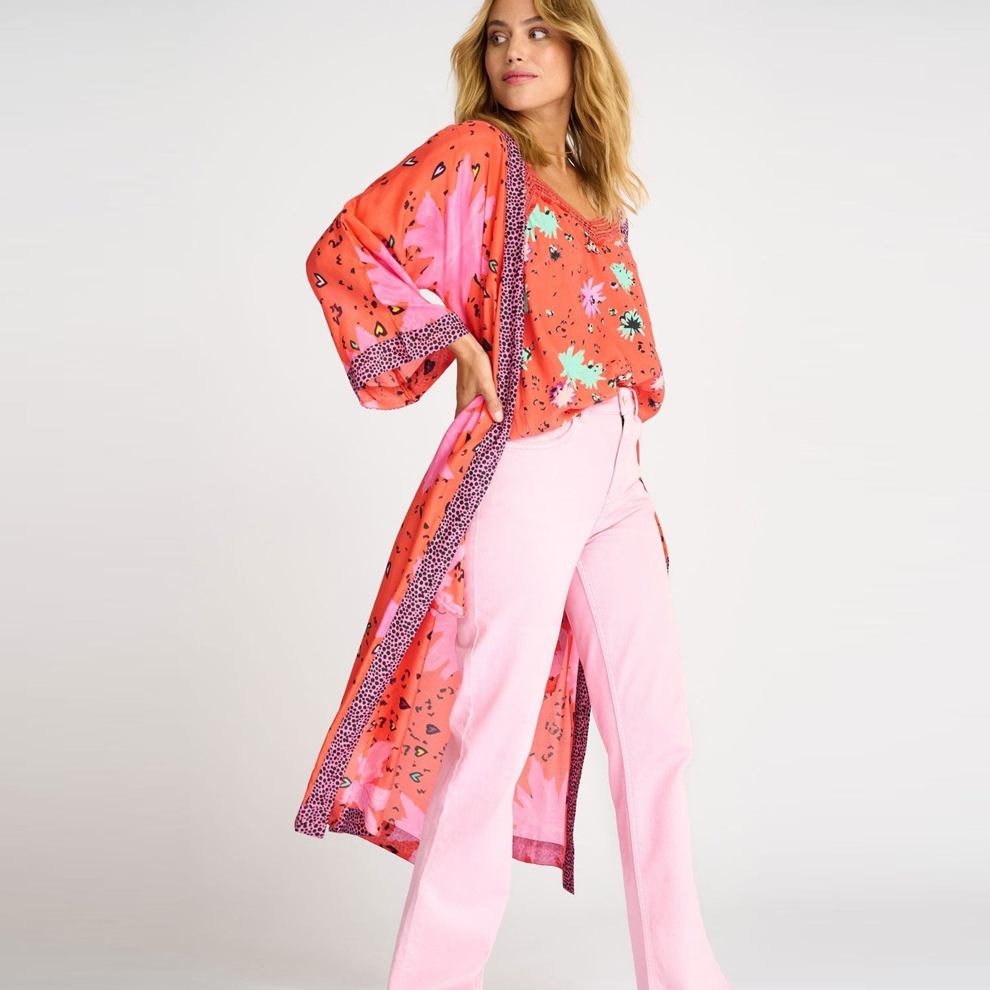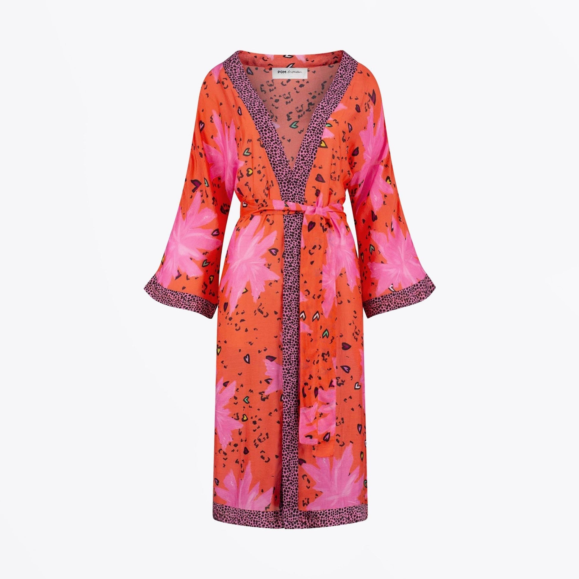 Pom Amsterdam is a brand that celebrates bursting colours and bold prints. The detailing and colourful design embraces individuality and feminine fashion pieces that are defined by exciting details and the use of fine, natural materials. This red kimono with pink accents is perfect for a romantic summer evening. The kimono, made of sustainable cupro, has beautiful pink flowers and a confetti print. The cuffs are decorated with black dots on a pink background. Wear the kimono with jeans with a t-shirt underneath or wear it over your bikini on the beach on a warm summer's day.
