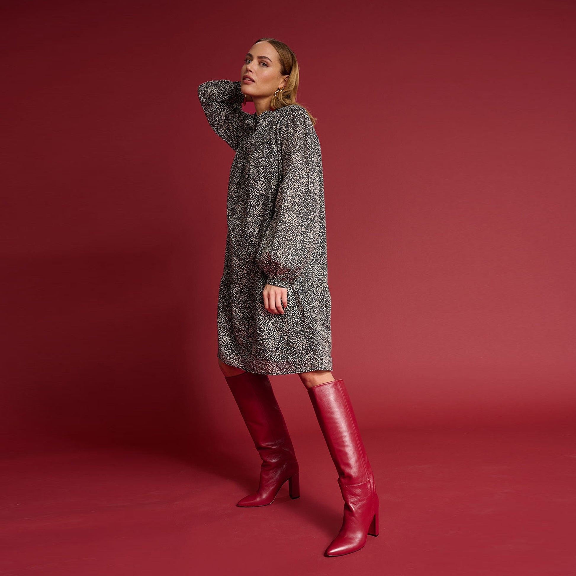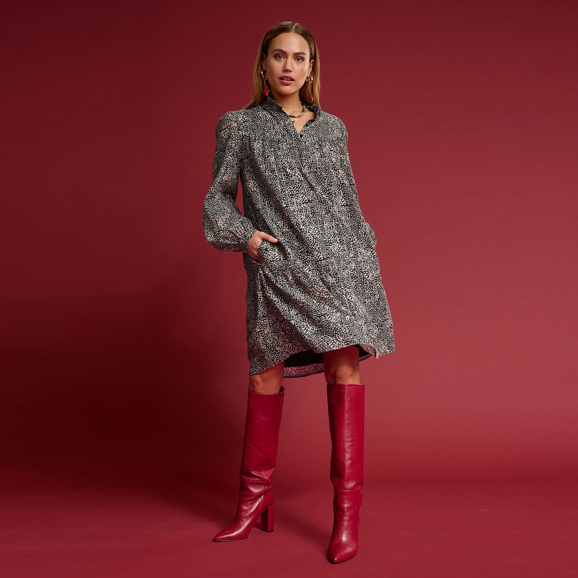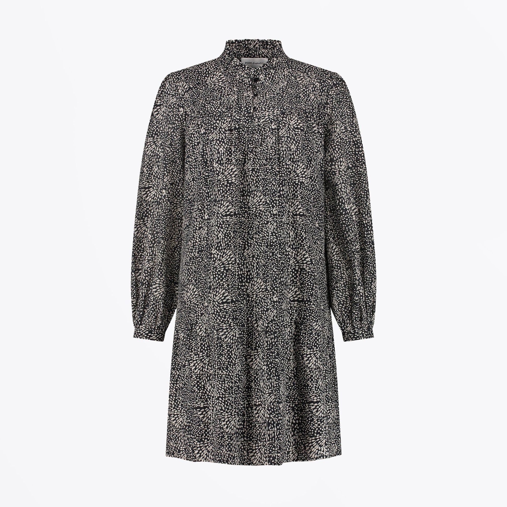 Pom Amsterdam is a brand that celebrates bursting colours and bold prints. The detailing and colourful design embraces individuality and feminine fashion pieces that are defined by exciting details and the use of fine, natural materials. You need this black dress with white specks this autumn! The dress has an A-line fit and falls down to the knee. A golden lurex thread runs through the fabric. There are black buttons in the neck and a subtle ruffle on the upright collar. The dress has wide, long sleeves.