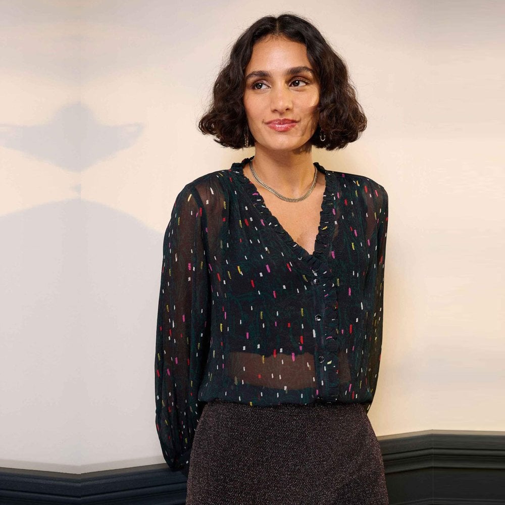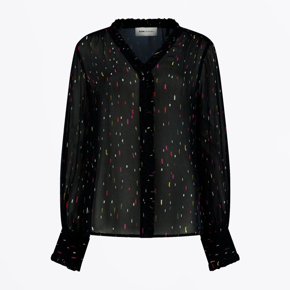 Pom Amsterdam is a brand that celebrates bursting colours and bold prints. The detailing and colourful design embraces individuality and feminine fashion pieces that are defined by exciting details and the use of fine, natural materials. This printed top crafted in 100% viscose is the perfect piece to add to your wardrobe. This black blouse consists of a print of dashes of different colours printed on it. The v-neckline, button row and cuffs have subtle ruffles. The transparent fabric gives the blouse an extra elegant touch.