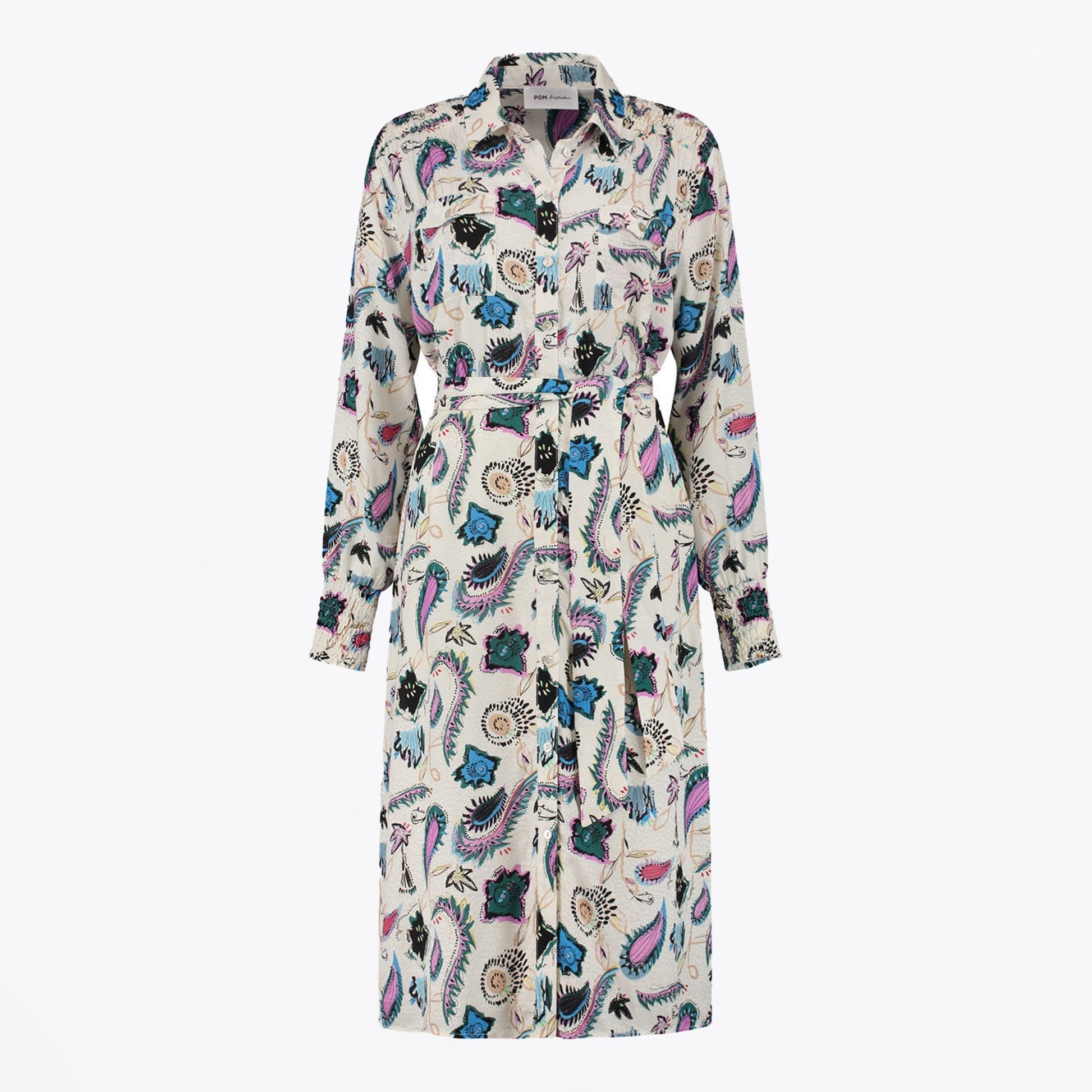 Pom Amsterdam is a brand that celebrates bursting colours and bold prints. The detailing and colourful design embraces individuality and feminine fashion pieces that are defined by exciting details and the use of fine, natural materials. Add some fun pattern to your new season wardrobe with a designer shirtdress from Pom Amsterdam. This dress features a hand-drawn style print of botanical motifs with some elements of paisley throughout, in purple blue and green shades. This dress also has a collared neckline, with mother of pearl buttons, buttoned breast pockets, and elasticated gatherings at the shoulders, cuffs, and yolk. Wear this dress with some Veja trainers to wear this dress more casually.