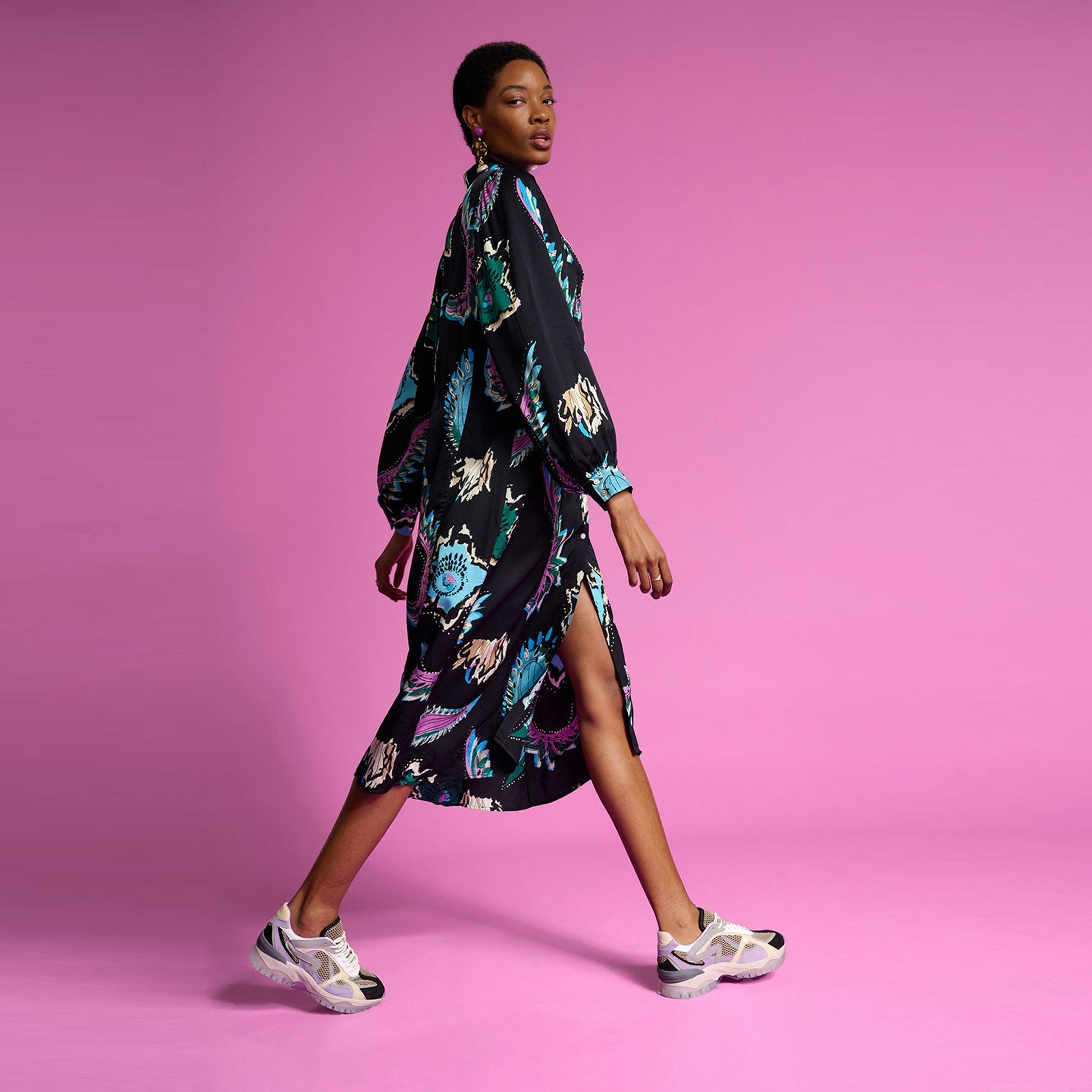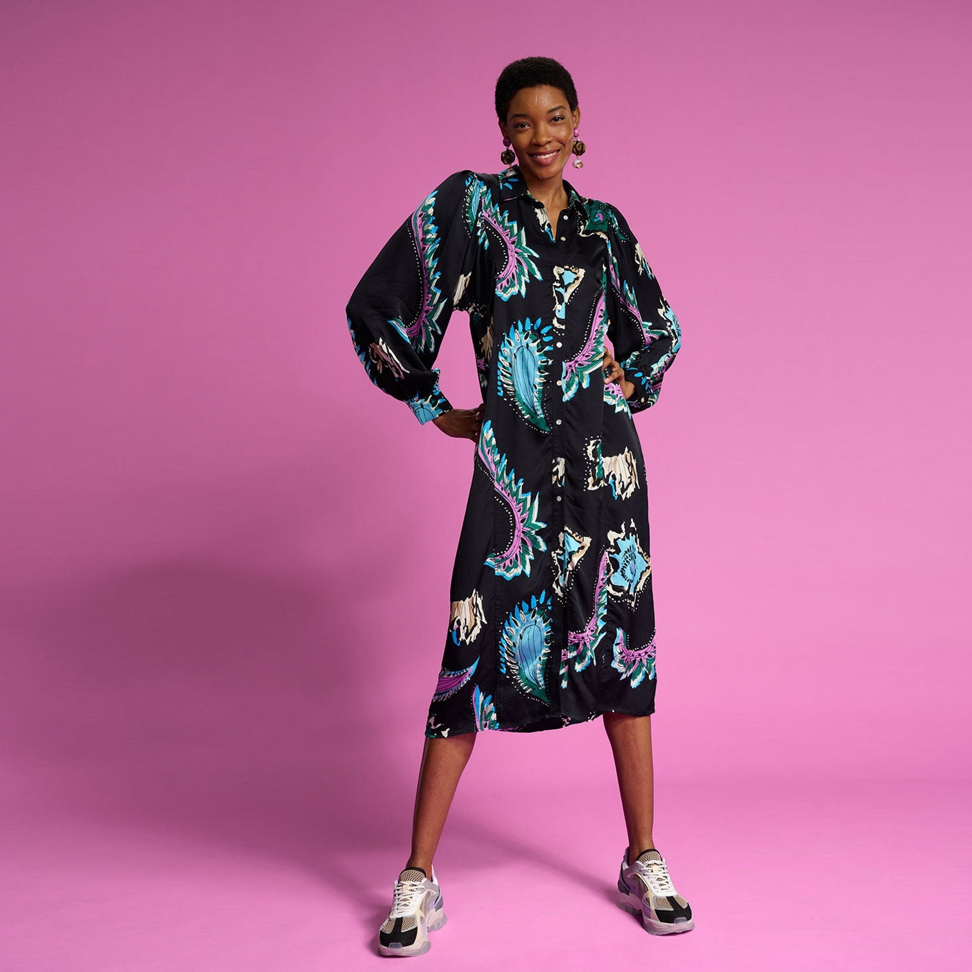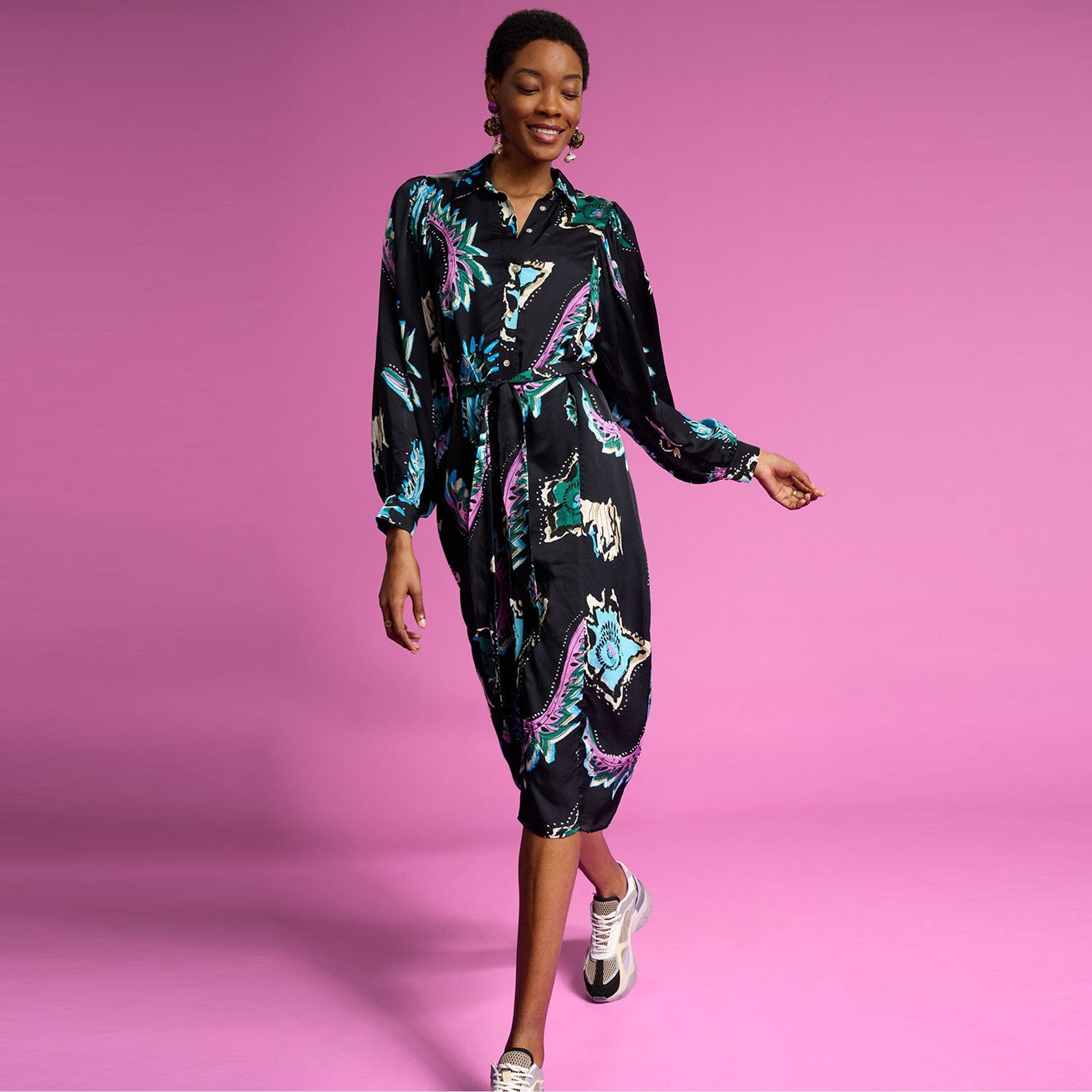 Pom Amsterdam is a brand that celebrates bursting colours and bold prints. The detailing and colourful design embraces individuality and feminine fashion pieces that are defined by exciting details and the use of fine, natural materials. This black dress has a high quality appearance due to the beautiful sustainable viscose fabric with satin look. Combine the black dress with hand-painted print with a great pair of heels or elegant boots. The dress has long, wide sleeves and a sash around the waist. The button fastening is mother-of-pearl.