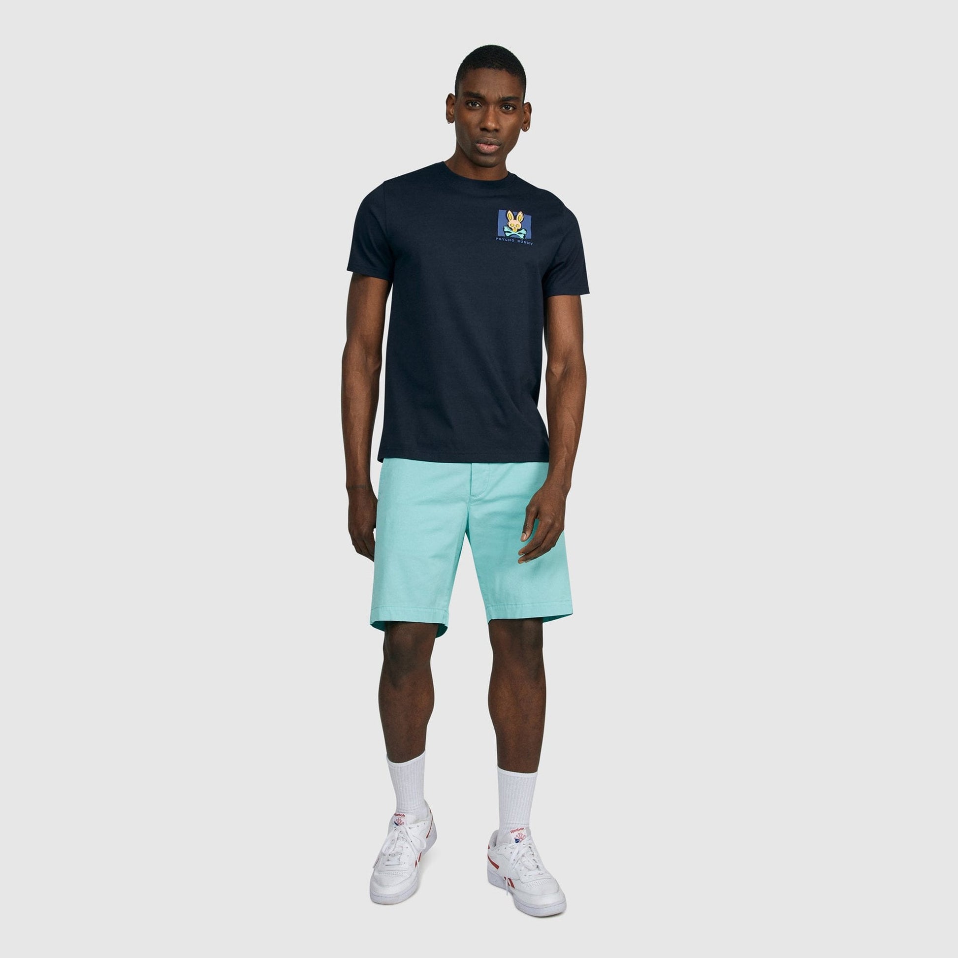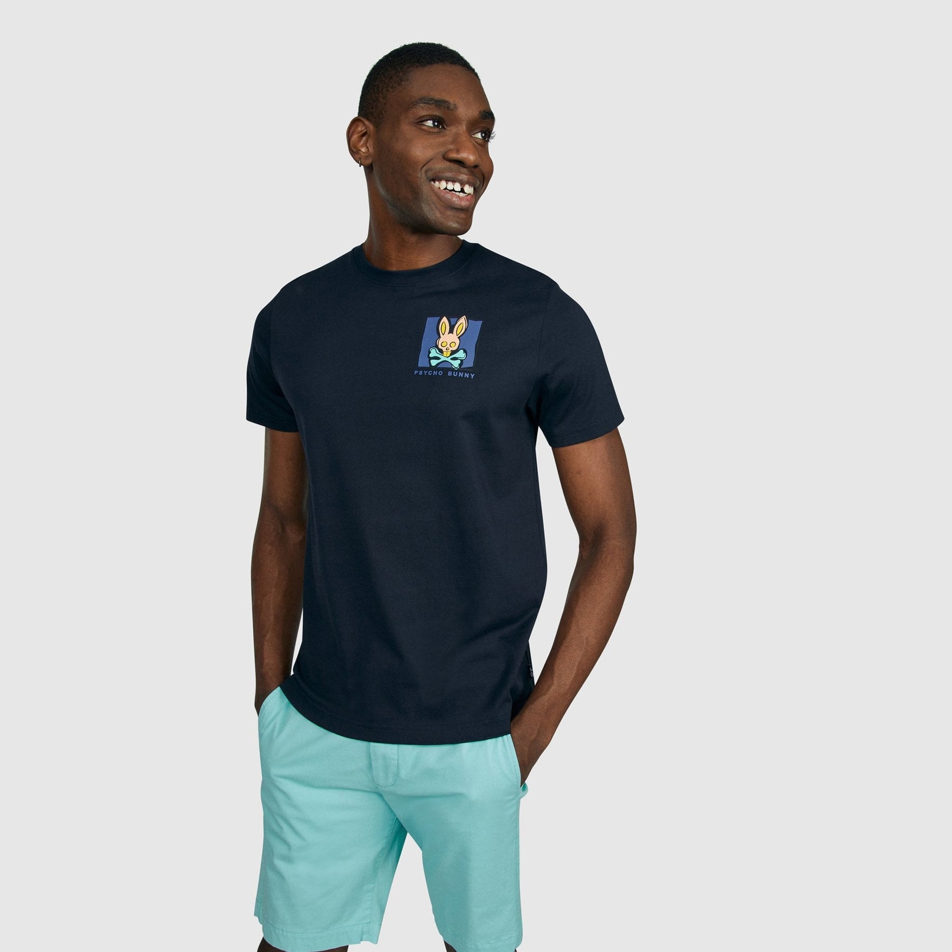 Created in 2005 by Robert Godley, the ex-creative director for Polo Ralph Lauren, Psycho Bunny creates timeless, cool wardrobe essentials that reflect your unique spin on life. Made of 100% Pima cotton, this navy graphic tee fits better than any you've worn and will reliably maintain its shape, wash after wash. Psycho Bunny's trusted trim fit hits the sweet spot between classic and slim, and is cut a little bit longer than the average t-shirt. Features include taped seams and a screen printed version of a hand-painted Psycho Bunny graphic on both the back and left chest, offering an expressive pop of colour.