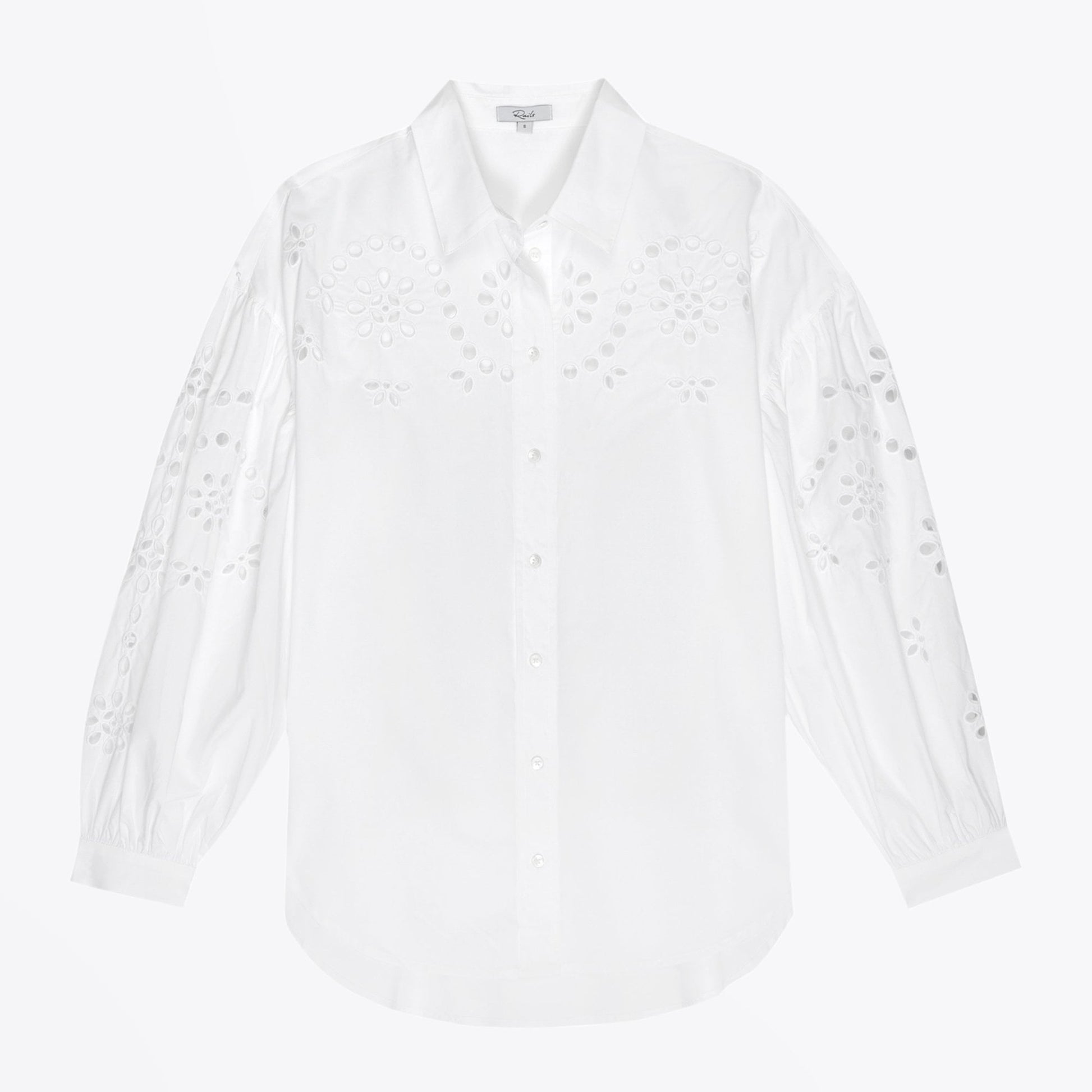 Relaxed and refined label, Rails is synonymous with accessible luxury by using premium fabrications in classic silhouettes, and has quickly evolved into a global lifestyle brand. Lightweight cotton poplin, long sleeve, crisp white collared button-down shirt features eyelet embroidery at the front of neckline and sleeves. With an oversized fit, dropped shoulder, and full sleeves with shirring this shirt is perfect to take you from work to weekend with this feminine take on the classic button-down shirt.