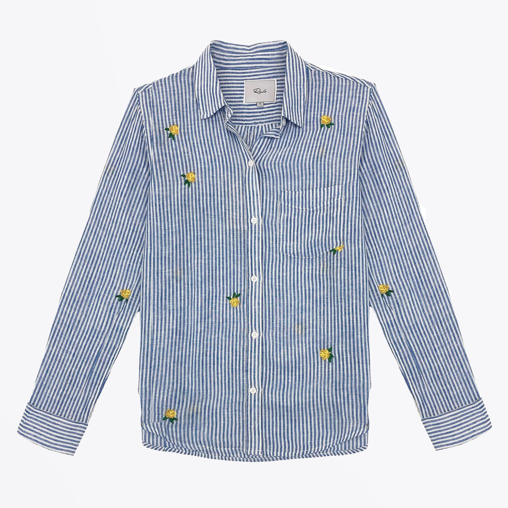 Relaxed and refined label, Rails is synonymous with accessible luxury by using premium fabrications in classic silhouettes, and has quickly evolved into a global lifestyle brand. This long sleeve, lightweight breezy yellow rose embroidered shirt drapes beautifully to create a relaxed feminine silhouette for effortless style and a flattering fit. This button-down striped shirt with high-low shirt-tail hem features a single chest pocket. A versatile piece that will take you from office to evening drinks.