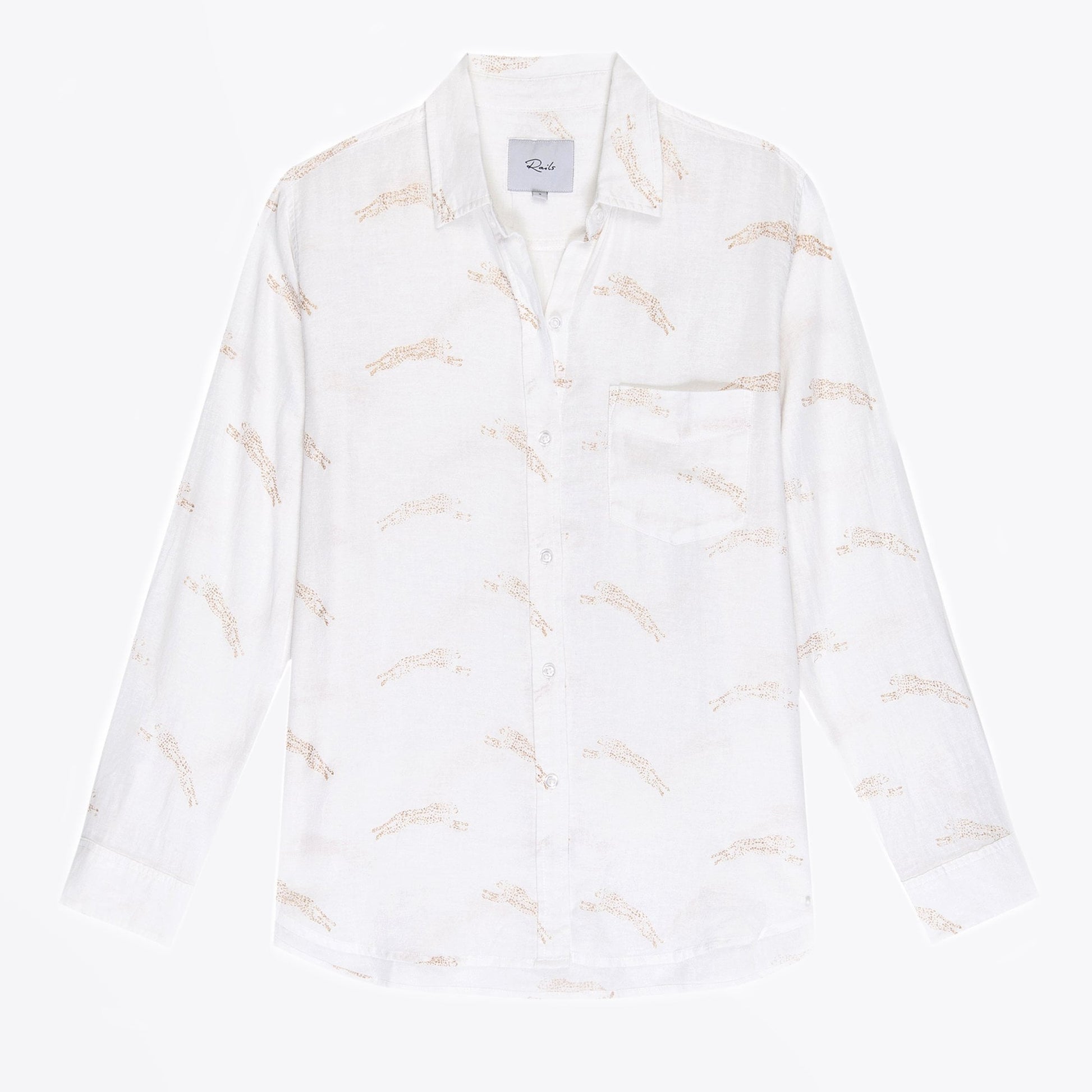 Luxe linen, long sleeve, crisp white buttondown shirt featuring gold glitter cheetah cat print throughout, relaxed fit, and patch pocket at chest. Lightweight, breezy linen fabric mixed with a relaxed body shape makes the Charli the perfect Southern California inspired button-down.