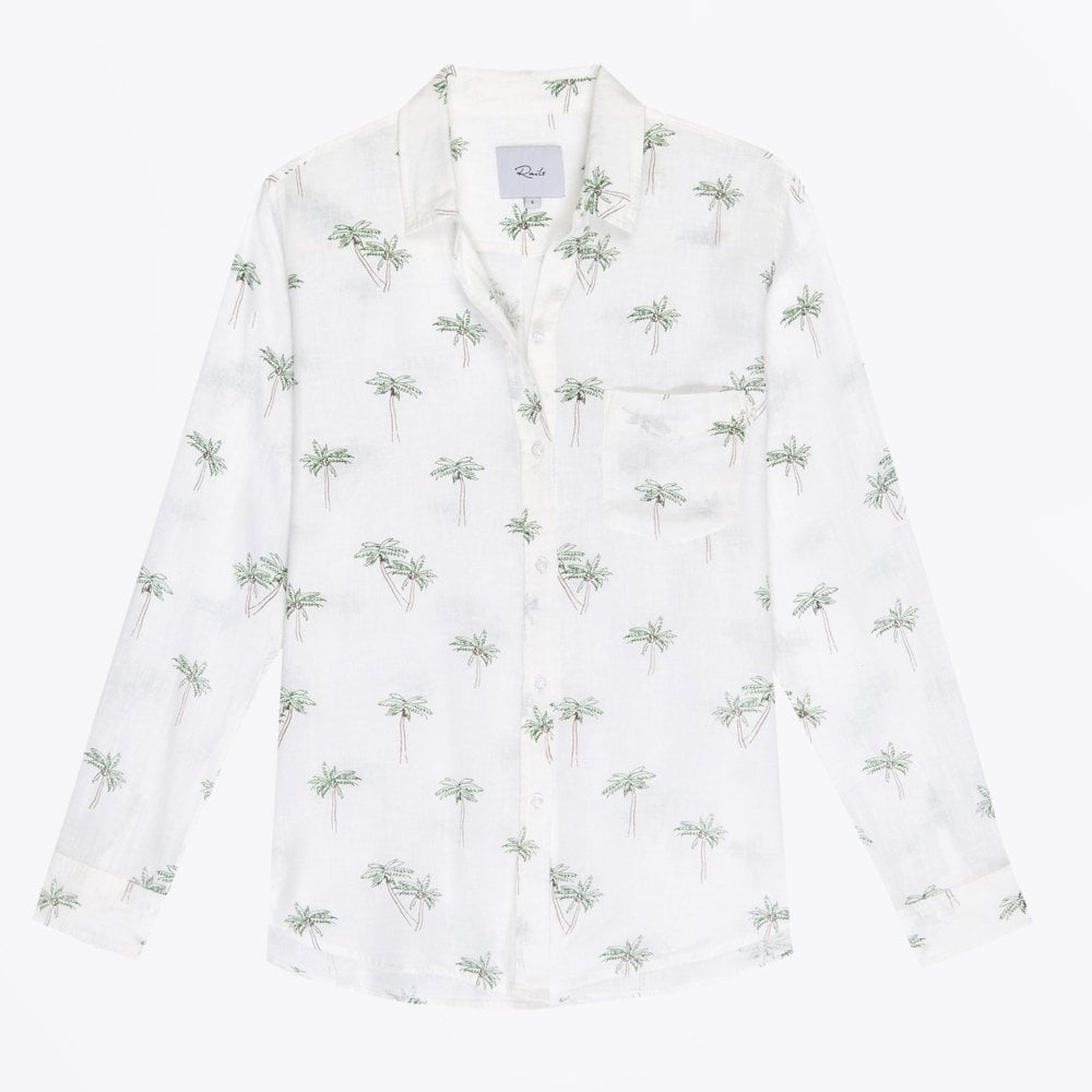 Relaxed and refined label, Rails is synonymous with accessible luxury by using premium fabrications in classic silhouettes, and has quickly evolved into a global lifestyle brand.  This luxe linen, long sleeve, warm ivory buttondown shirt featuring green sketched palm tree print throughout, relaxed fit, and patch pocket at chest. Lightweight, breezy linen fabric mixed with a relaxed body shape makes the Charli the perfect Southern California inspired button-down.