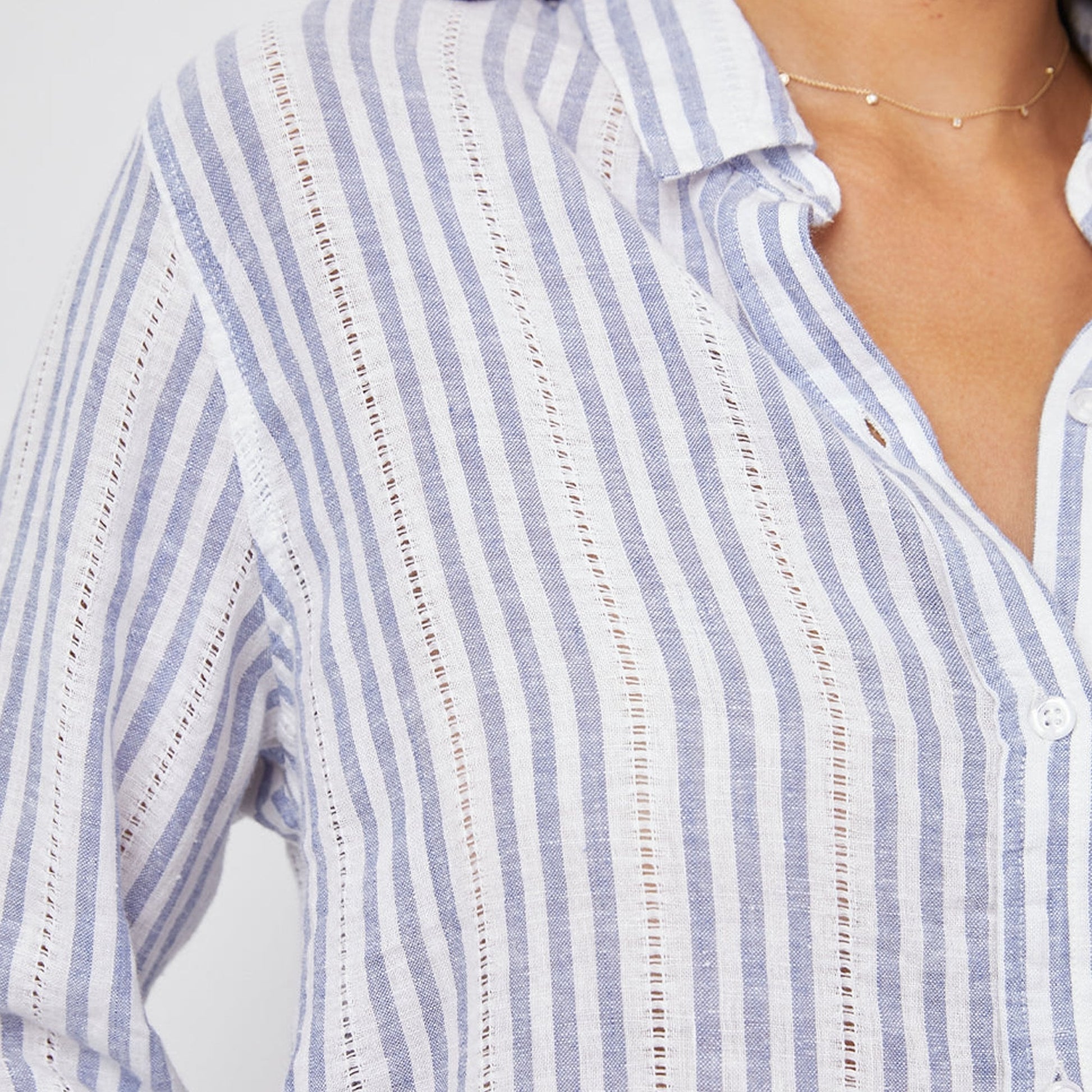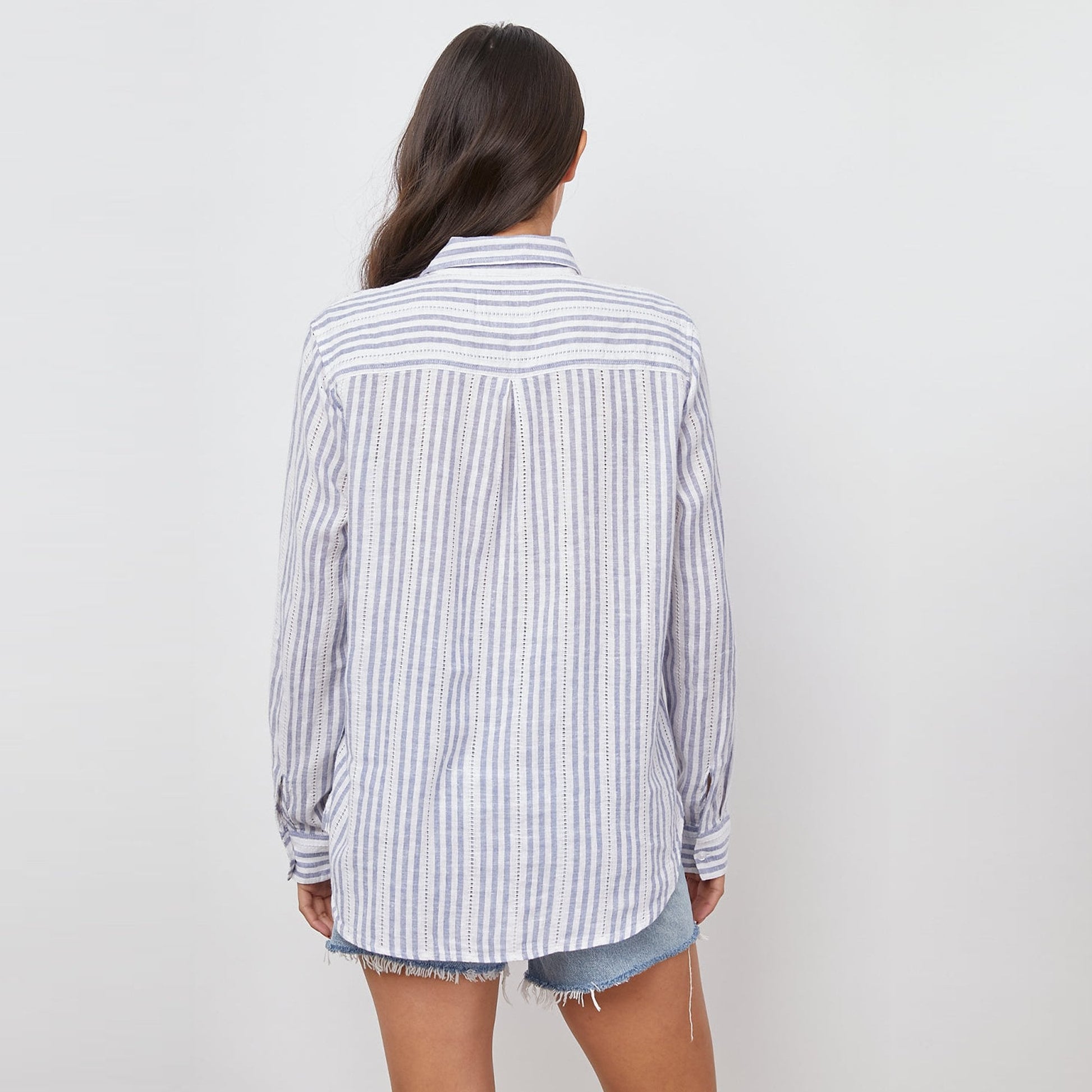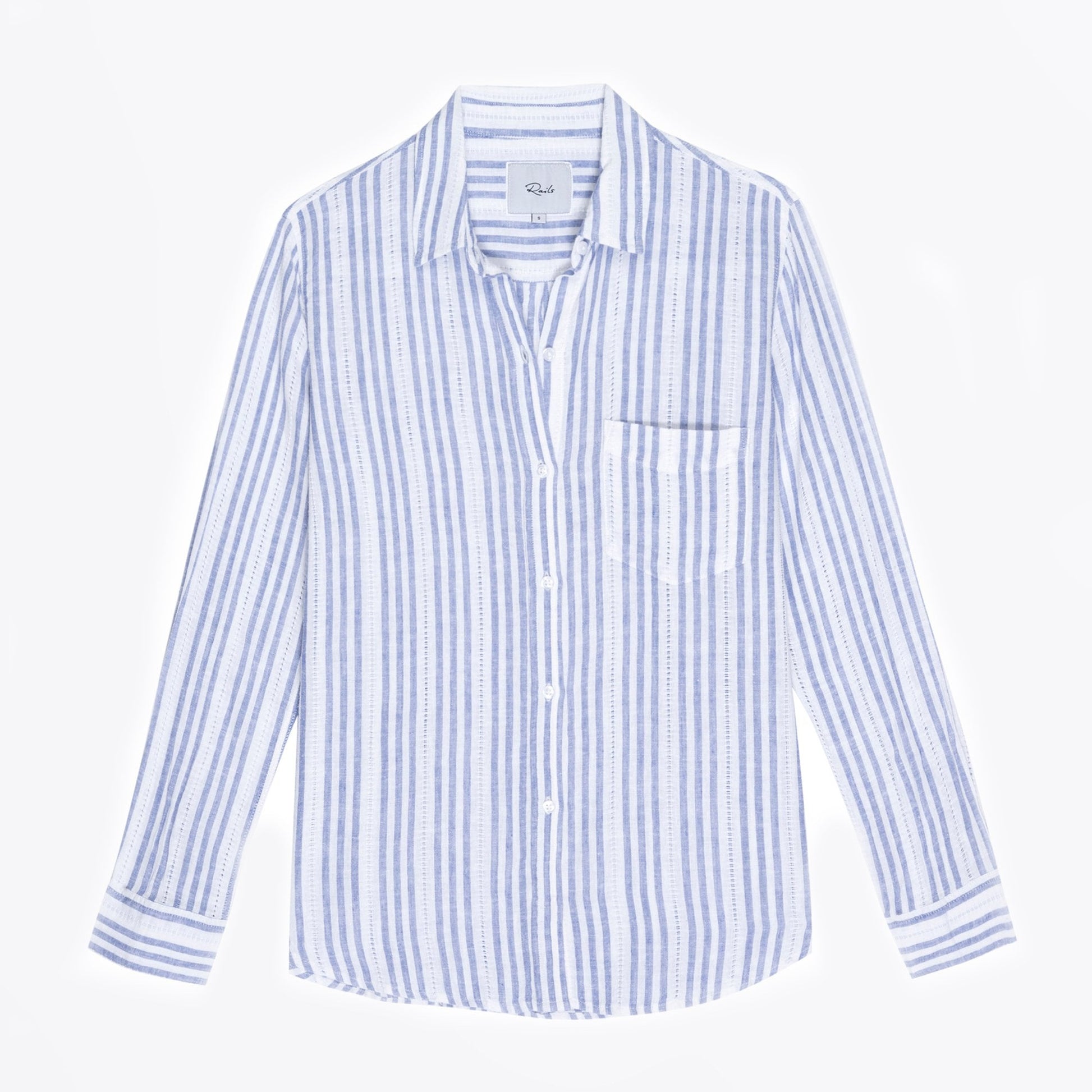 Relaxed and refined label, Rails is synonymous with accessible luxury by using premium fabrications in classic silhouettes, and has quickly evolved into a global lifestyle brand. This long sleeve crisp white shirt features classic blue stripes with lace inset detailing. This lightweight, breezy, linen fabric mixed with a relaxed body shape makes this Charli shirt the perfect California inspired button-down. Added features of this top include a single patch pocket at the chest. This chic classic is a must-have for everyday elevated comfort.
