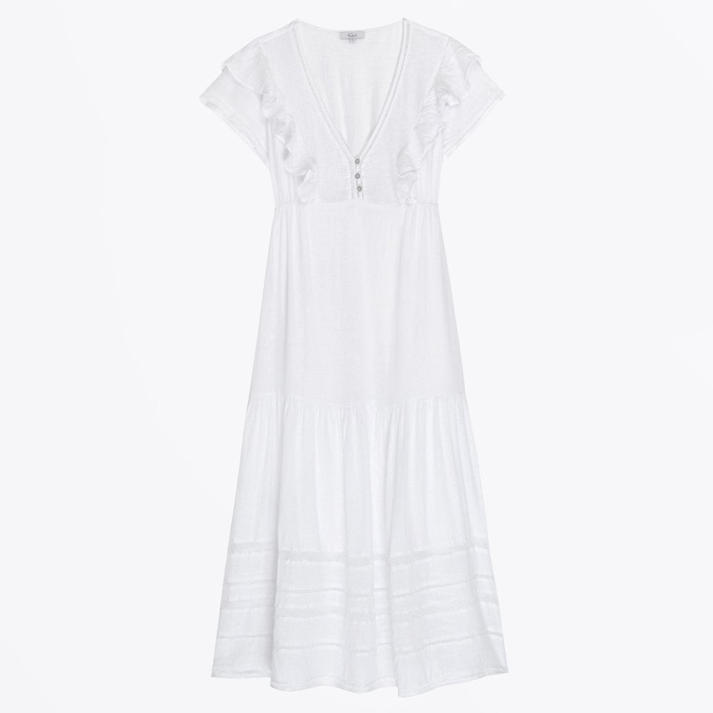 Relaxed and refined label, Rails is synonymous with accessible luxury by using premium fabrications in classic silhouettes, and has quickly evolved into a global lifestyle brand.  This lightweight luxe linen, short sleeve, lined, crisp white midi dress featuring inset lace throughout, v-neckline with four loop buttons, cap sleeves with flutter detail, elastic waist, flowy tiered skirt, and natural shell buttons. This effortless, feminine dress is the perfect throw-on-and-go style for any occasion.