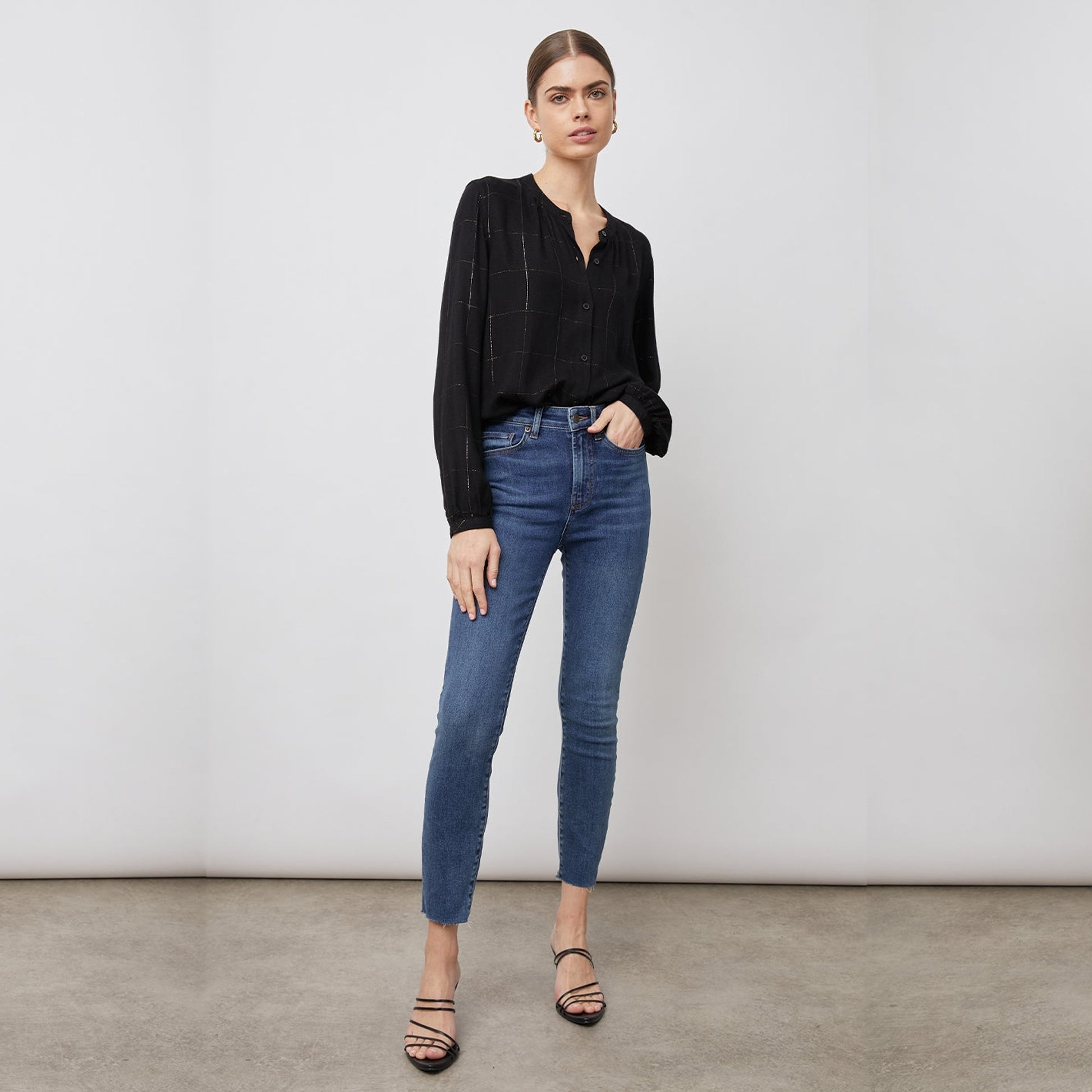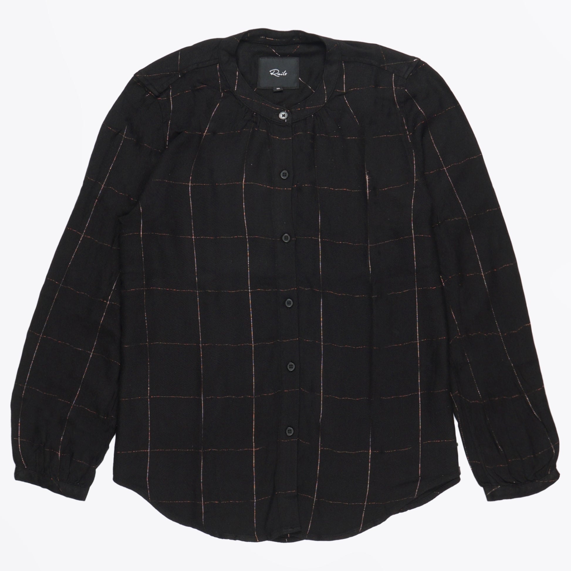 Relaxed and refined label, Rails is synonymous with accessible luxury by using premium fabrications in classic silhouettes and has quickly evolved into a global lifestyle brand. A gloriously silky shirt to add a bit of sparkle to your seasonal wardrobe, this shirt features a gold and copper check design through a herringbone weave material in black. This button-down shirt has a banded collar, with buttoned cuffs, and a loose gathered back, which gives a fabulous feminine silhouette. Style this blouse with a pair of Paige jeans and some heeled boots for an elevated casual look.