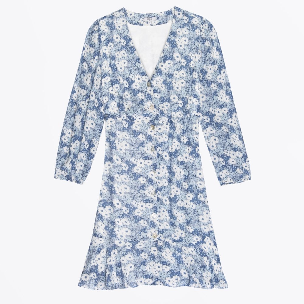 Relaxed and refined label, Rails is synonymous with accessible luxury by using premium fabrications in classic silhouettes, and has quickly evolved into a global lifestyle brand.  This soft textural rayon chiffon, long sleeve, lined, pastel blue mini dress featuring tonal floral print throughout, front button closures, v-neckline, elastic waist, flounce detail at hem, and large natural shell buttons. Feminine and flattering, this dress is the perfect throw-on-and-go style for any occasion.