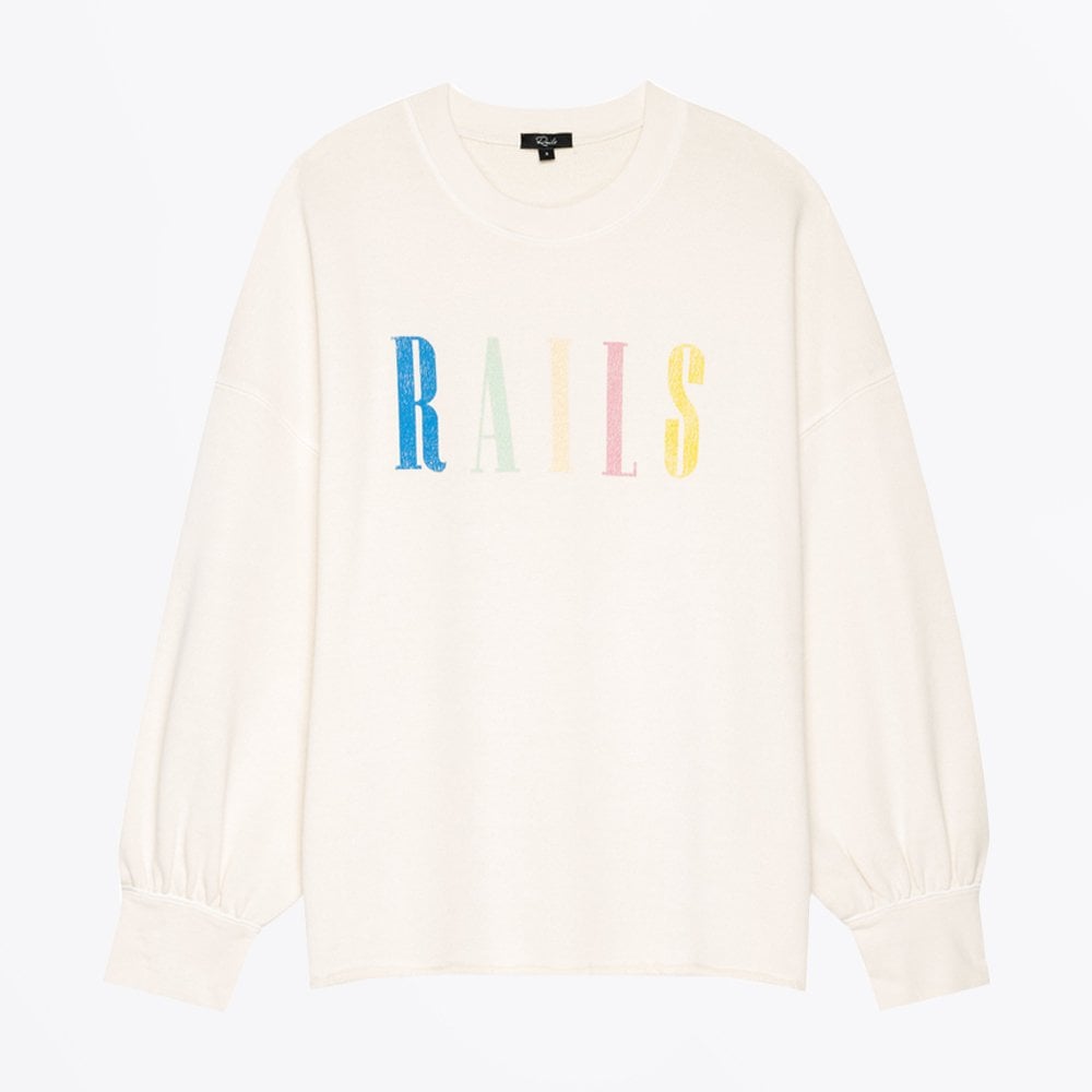 Relaxed and refined label, Rails is synonymous with accessible luxury by using premium fabrications in classic silhouettes, and has quickly evolved into a global lifestyle brand. This super soft, long sleeve, cream ivory crew neck sweatshirt in a lounge terry fabric drapes beautifully to create an effortless style and a flattering fit. This oversized sweatshirt features dropped shoulder and cuff shirring detail to create a more voluminous sleeve and raw cut bottom hem. Dyed to create a vintage powdery effect while featuring multi-colored distressed RAILS logo. This fashion forward pullover style is perfect for relaxing at home or going about your day in the most comfortable.
